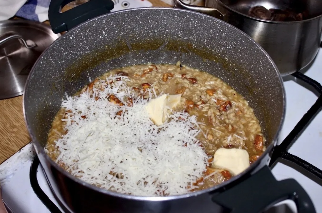 Na koniec dopraw solą i pieprzem (pamiętaj, aby nie solić zbyt mocno, ponieważ ser dodany na końcu jest już słony). Bulion musi być cały czas na ogniu i powoli gotować się, aby nie zatrzymać procesu gotowania ryżu podczas dolewania.