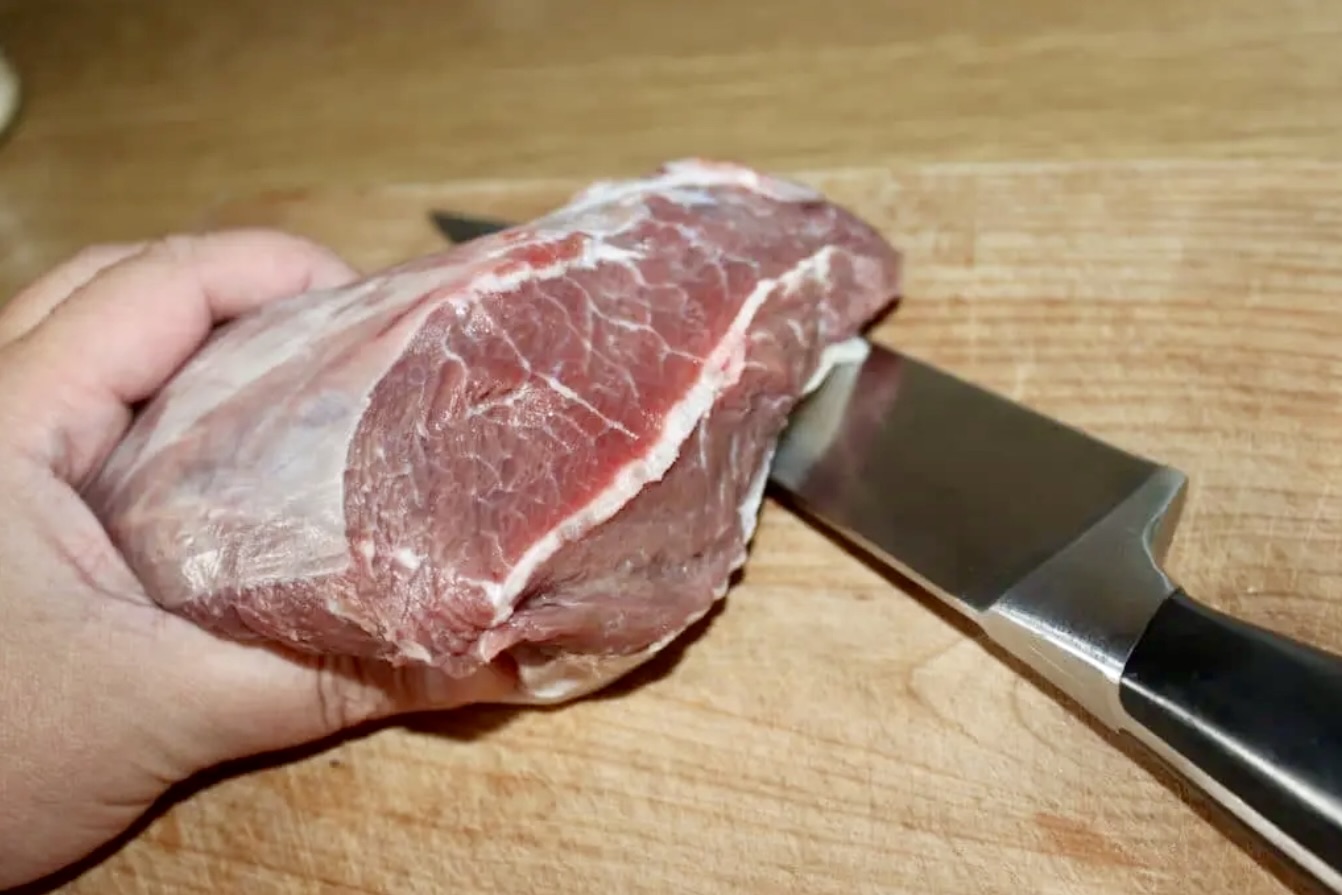 Wołowinę (np. plecówkę) oczyść z błony od spodniej strony, a następnie pokrój na nieduże kawałki.