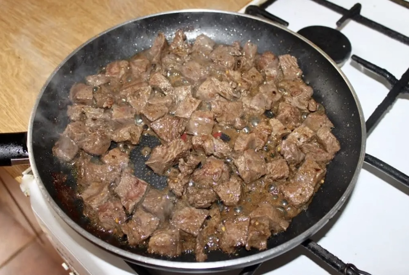 Smaż wołowinę na patelni na dość mocnym ogniu, aż się lekko zrumieni. Opcjonalnie posyp swoją ulubioną przyprawą.