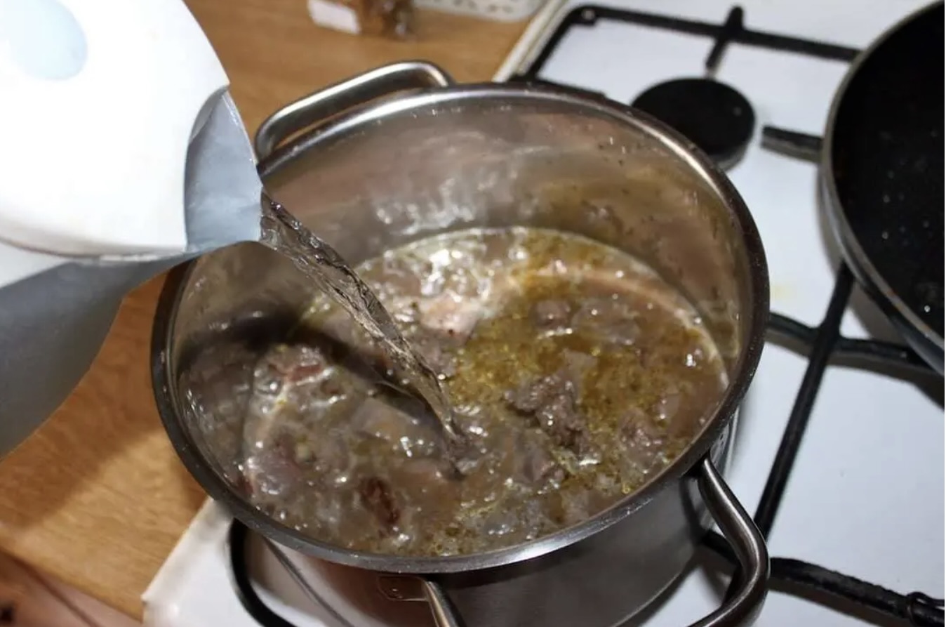 Przesmażone mięso przełóż do rondelka. Zalej je wrzątkiem tak, aby ledwie je zakrył.