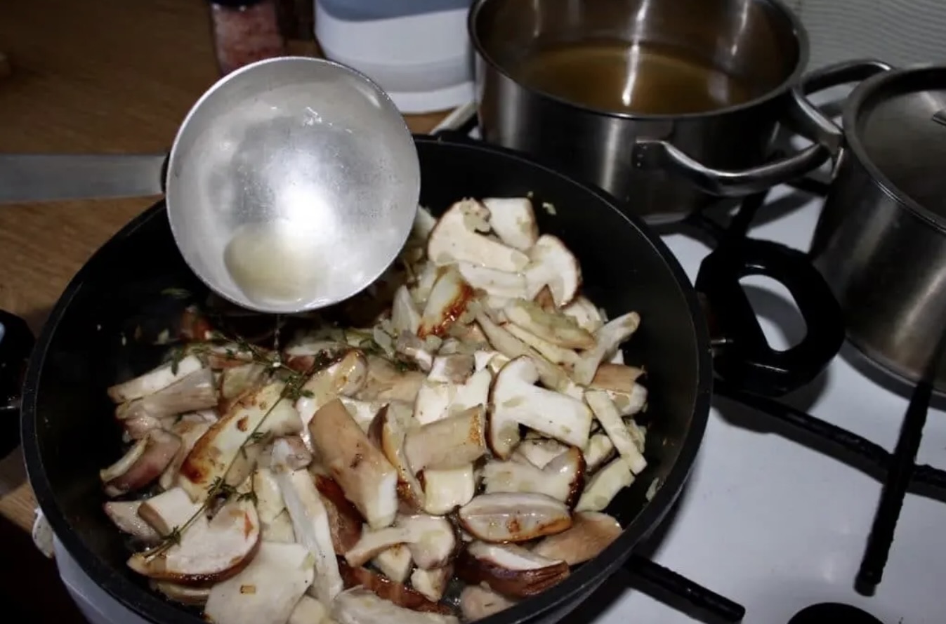 Wlej chochelkę wywaru z ugotowanych suszonych grzybów i zagotuj.