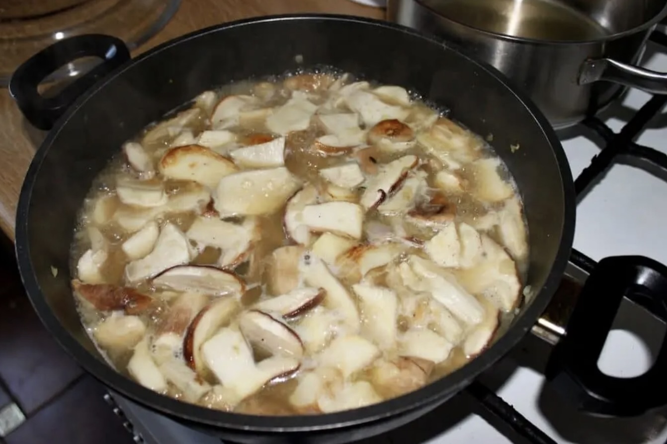 Dolej do grzybów resztę wywaru grzybowego. Wrzuć pokrojone, podgotowane kapelusze podgrzybków i duś wszystko razem około 10 minut, aż grzyby zmiękną.
