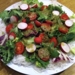Podanie: Na makaronie ułóż sałatę, połówki pomidorków i pokrojone rzodkiewki. Całość polej przygotowanym dipem. Na wierzchu ułóż pokrojonego w paski kurczaka.