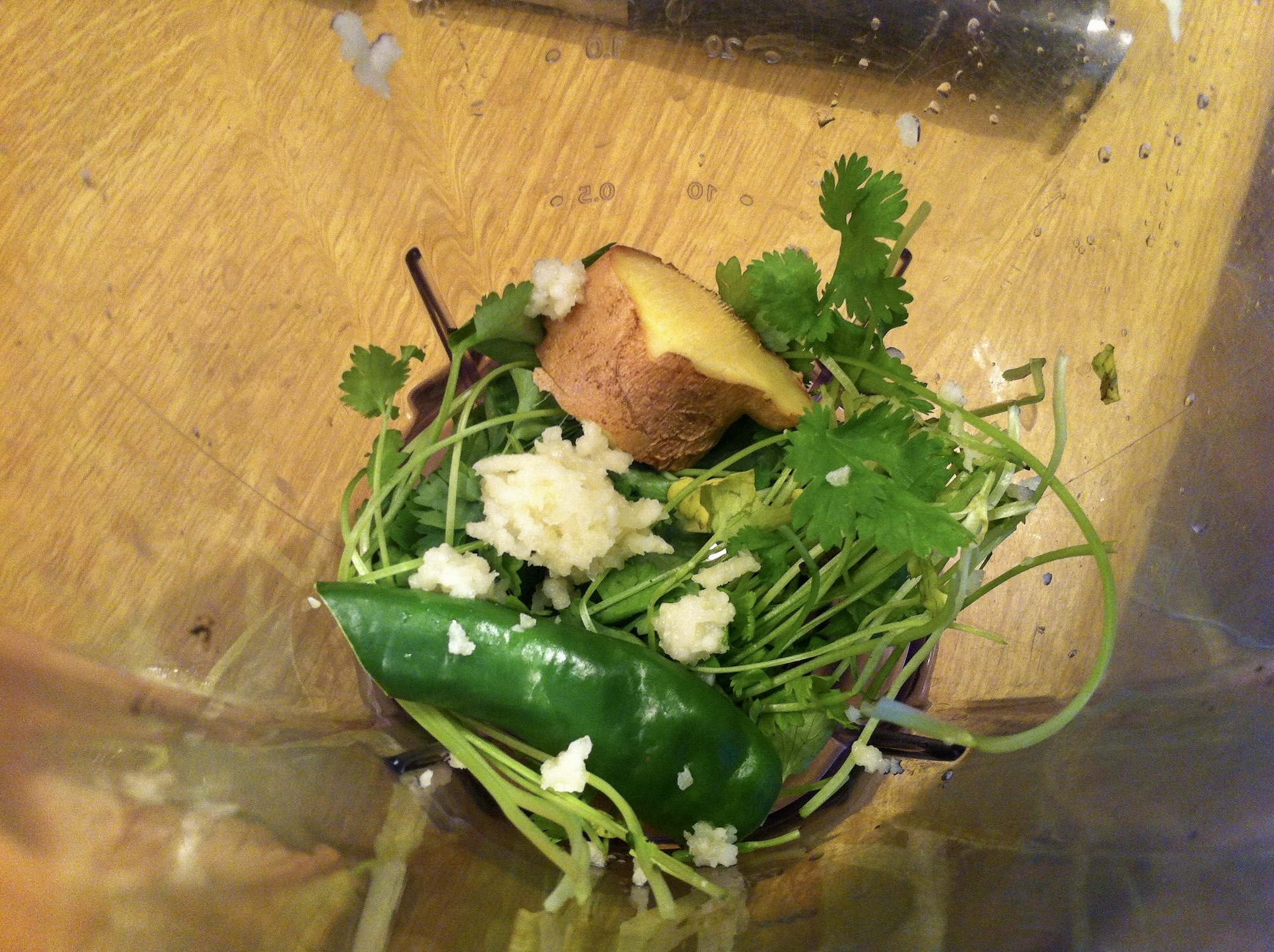 Warzywa: dwie garści pomidorków koktajlowych, garść rzodkiewek, dymka, zielona papryczka chili, kawałek świeżego imbiru, 2 ząbki czosnku