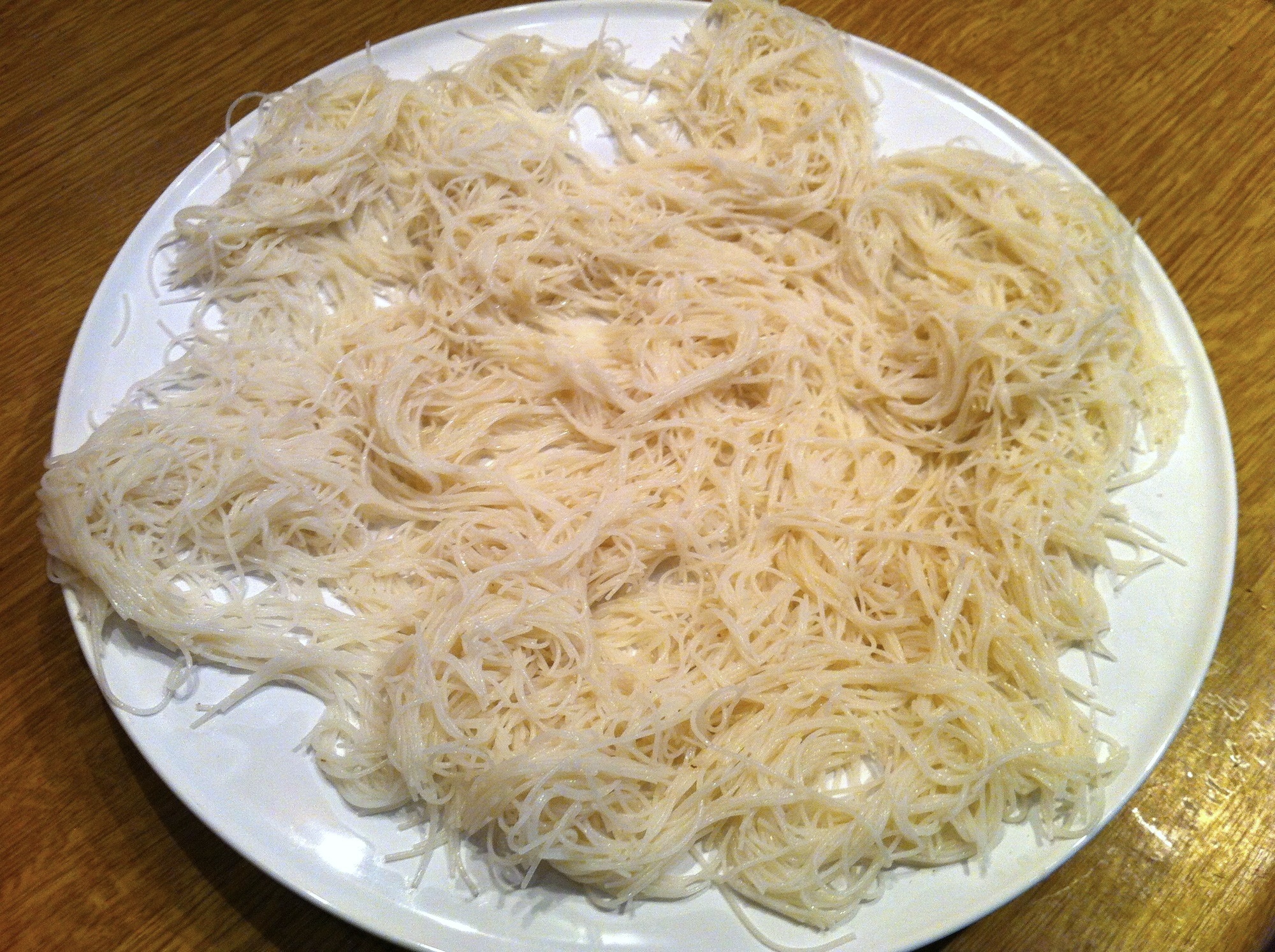 Makaron: Ugotuj makaron ryżowy zgodnie z instrukcją, odcedź, wymieszaj z 2 łyżkami oleju sezamowego, a następnie wyłóż na duży talerz.