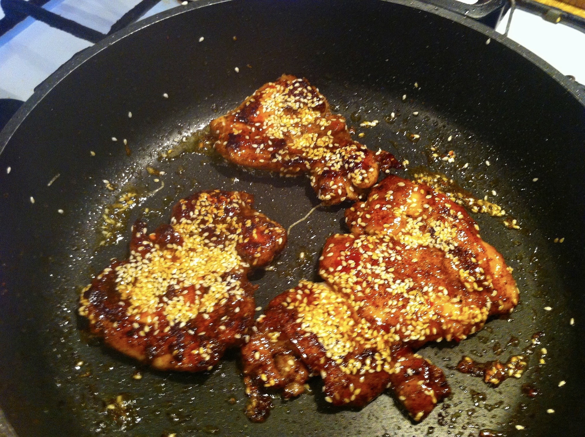 Kurczak: Mięso dopraw solą i obficie przyprawą pięciu smaków. Smaż na patelni po kilka minut z każdej strony. Pod koniec smażenia polej kurczaka miodem, aby go glazurować, a następnie posyp obficie sezamem i smaż jeszcze przez około 2 minuty, często odwracając. Odstaw do przestygnięcia.