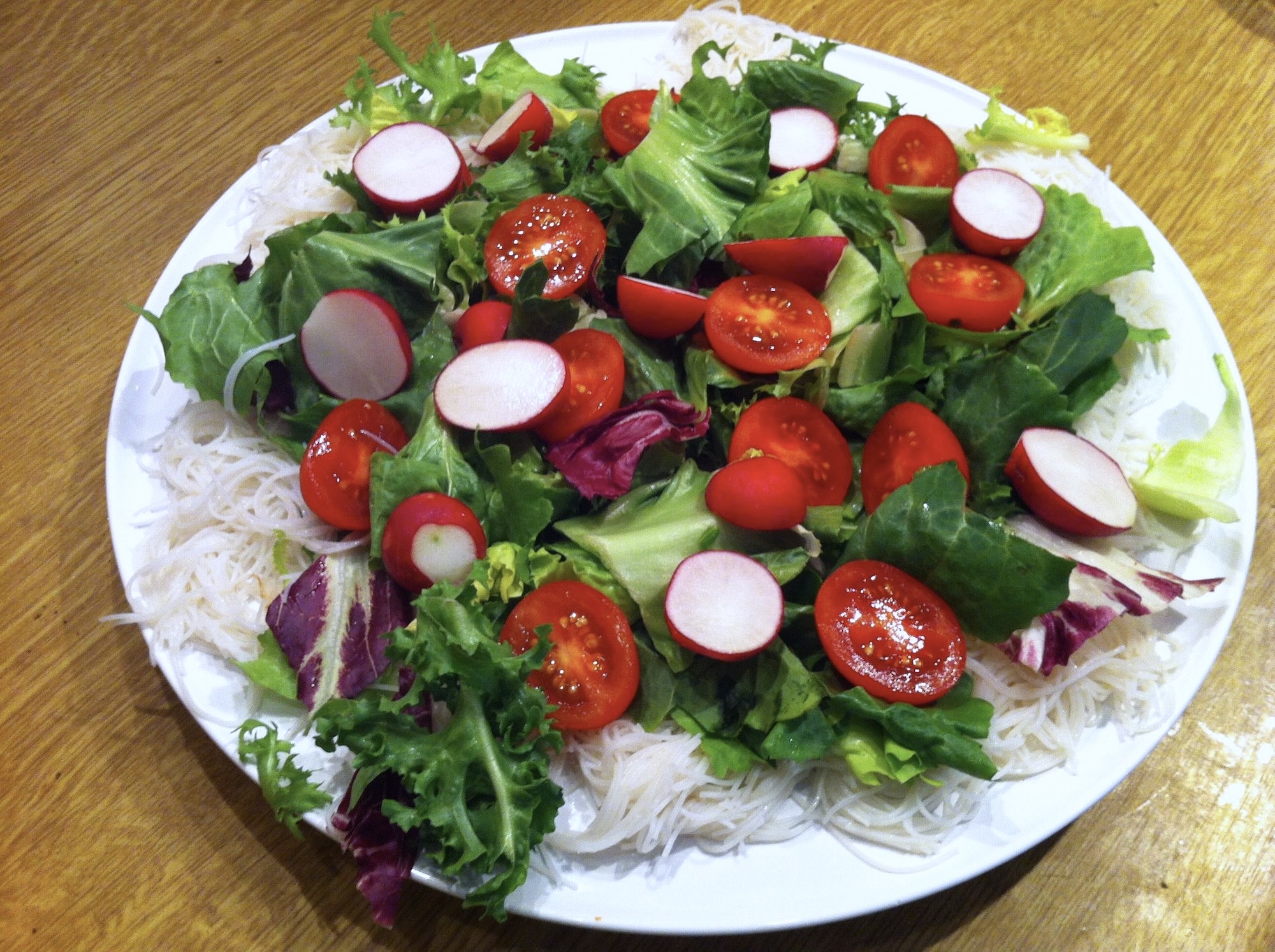 Baza: 250 g cienkiego makaronu ryżowego, opakowanie miksu sałat