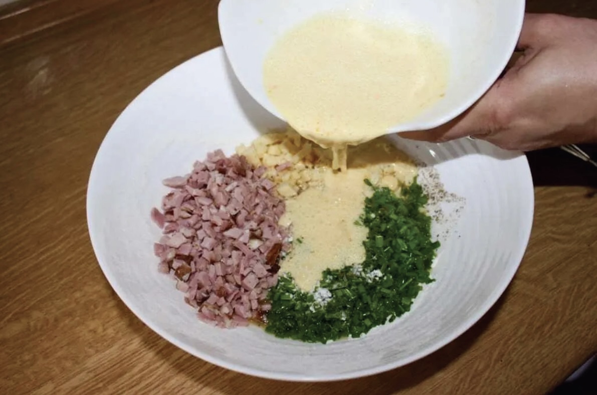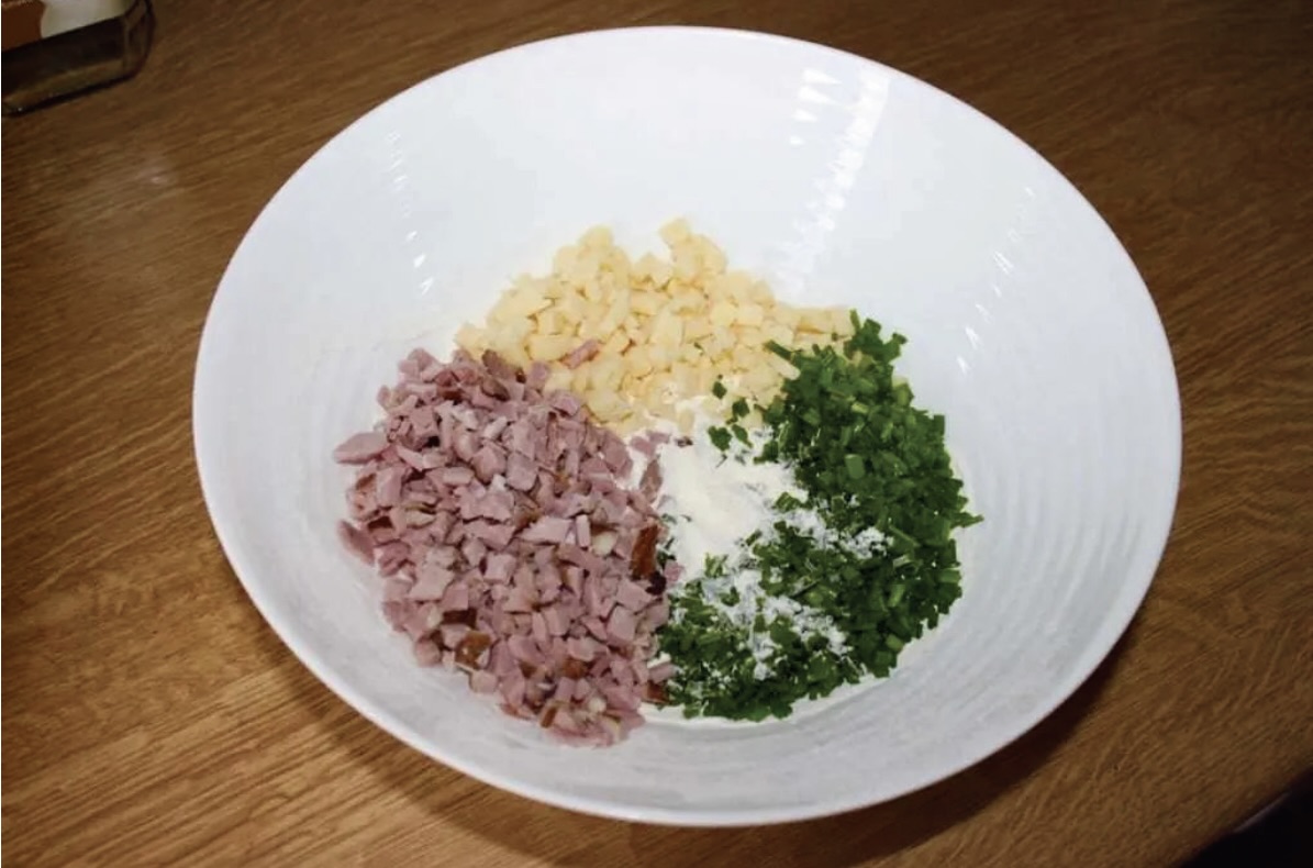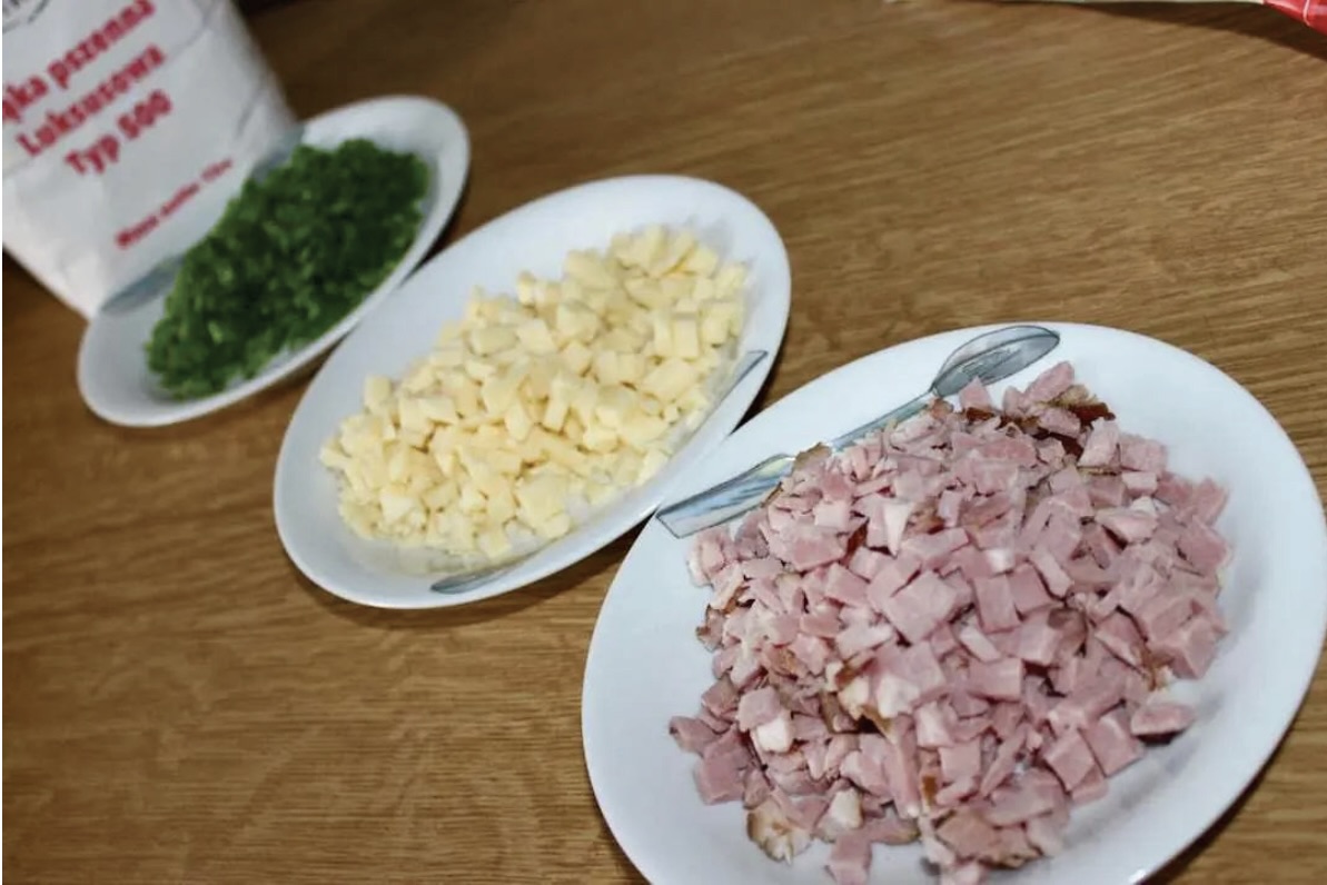 Przygotowanie składników: Roztop masło w rondelku i odstaw do przestygnięcia. Szynkę oraz ser pokrój w bardzo drobną kostkę. Szczypiorek (lub dymkę) posiekaj drobno.