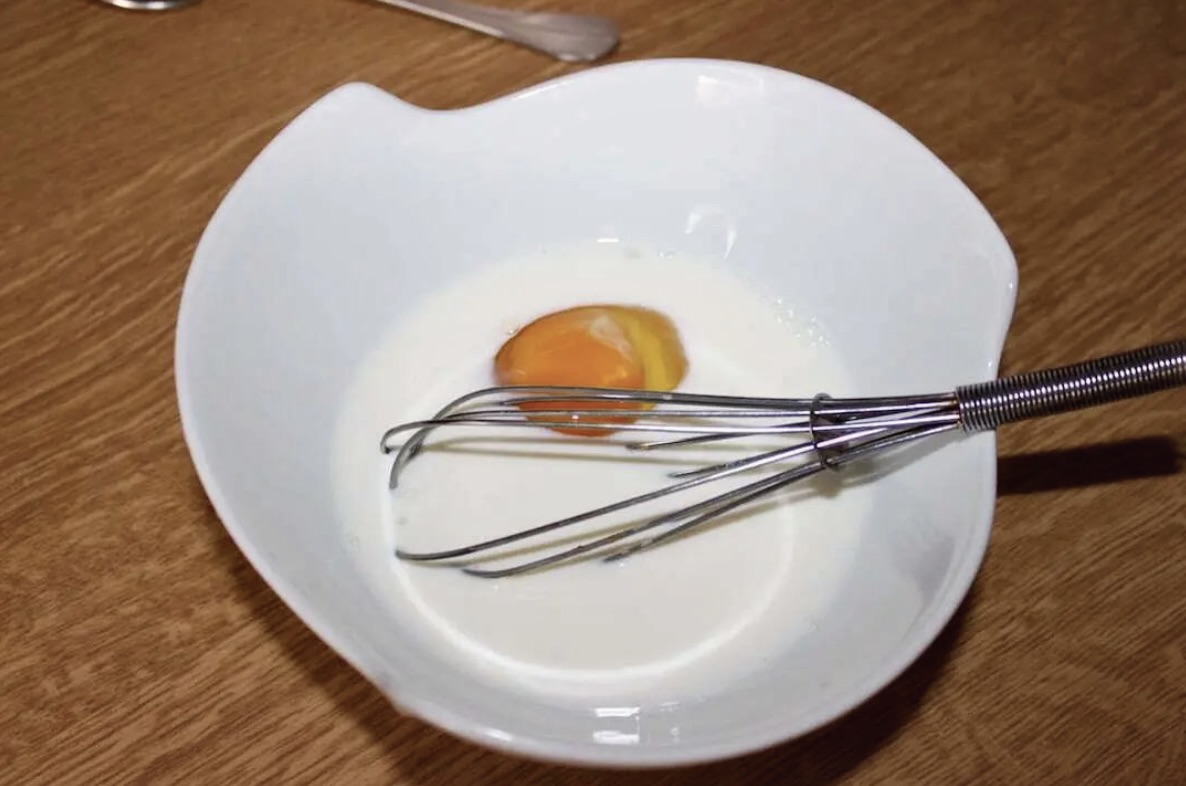 Przygotowanie masy: W osobnej misce roztrzep jajko z mlekiem i musztardą. Tak przygotowaną mieszankę wlej do miski z suchymi składnikami. Na koniec dodaj przestudzone masło.
