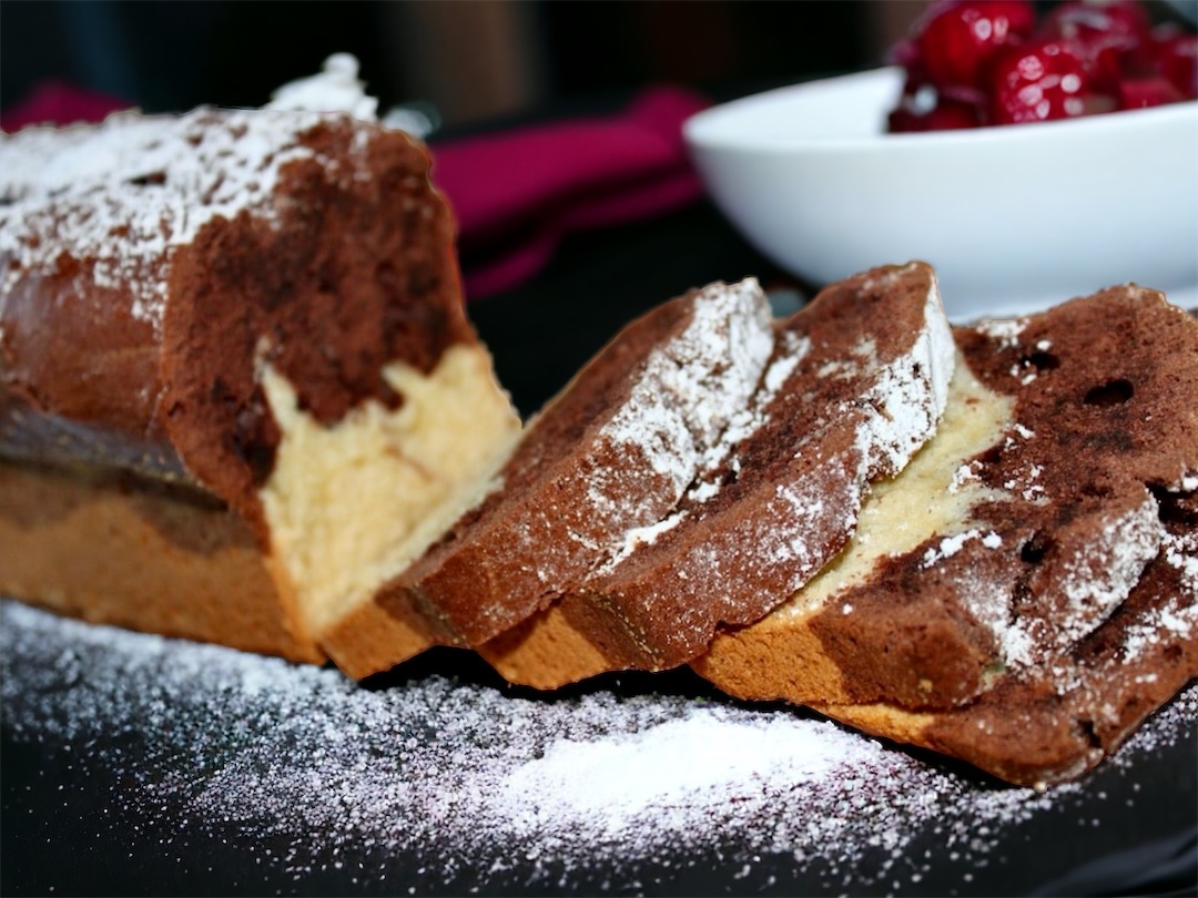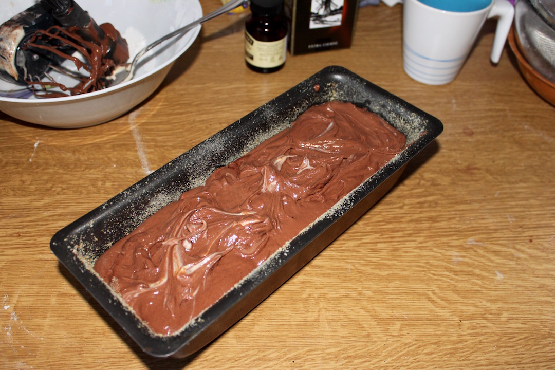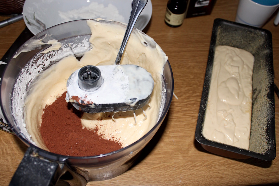 Formowanie marmurka: Połowę gotowej masy przełóż do formy. Do pozostałej połowy ciasta dodaj kakao i delikatnie wymieszaj. Wlej masę kakaową do formy.
