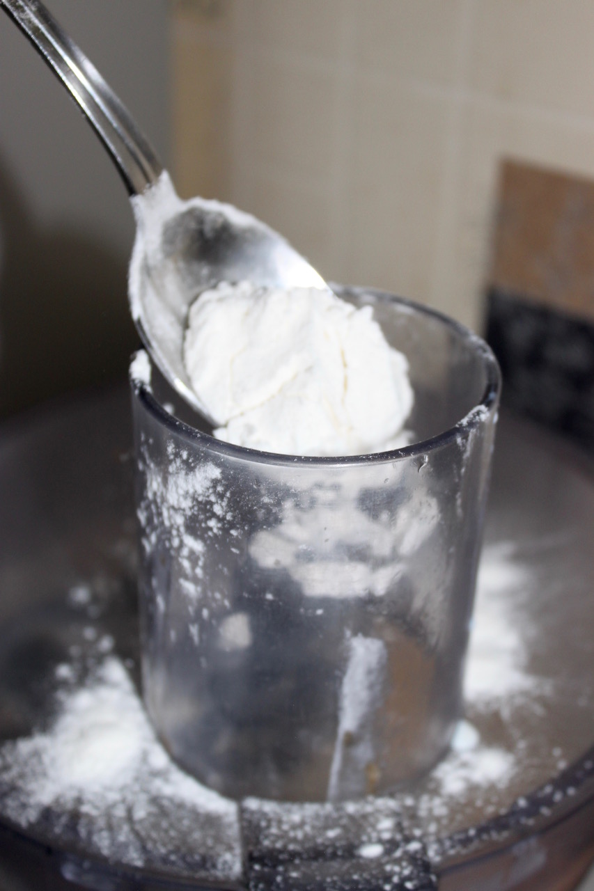 Przygotowanie składników sypkich: Do dużej miski przesiej mąkę pszenną i ziemniaczaną, dodaj proszek do pieczenia, a następnie wymieszaj.