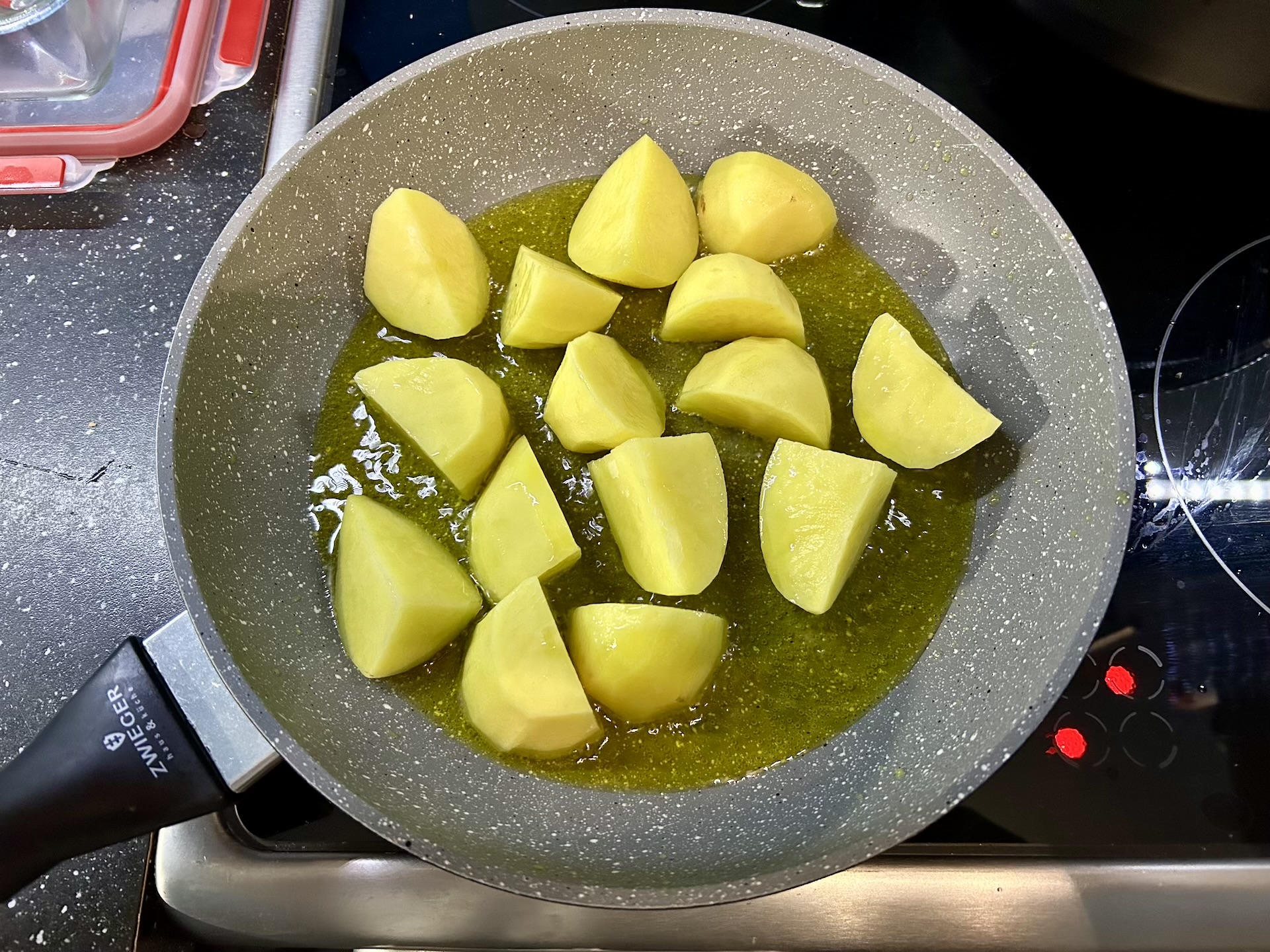 Na patelni (lub w garnku) rozgrzej oliwę. Wrzuć ziemniaki, a następnie smaż je przez 2–3 minuty na średnim ogniu, często mieszając.