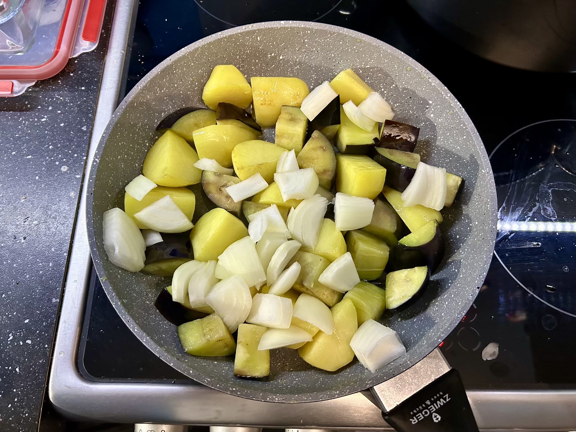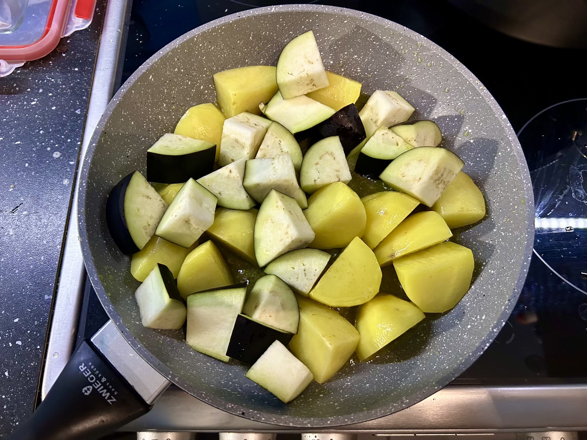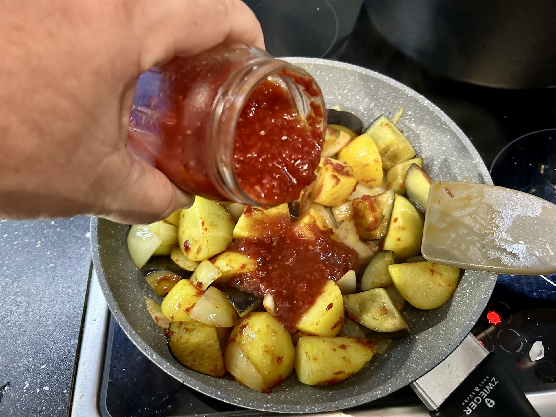 Dodaj odsączonego z wody bakłażana i smaż kolejne 3 minuty.