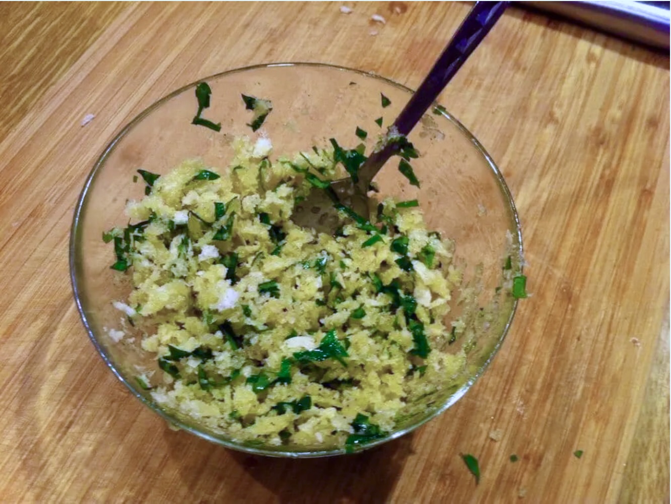 Przygotowanie farszu: Do małej miseczki wlej 4 łyżki oliwy extra vergine i wgnieć dwa obrane ząbki czosnku. Dodaj garstkę posiekanej natki pietruszki, a także drobno pokruszone okruchy czerstwego pieczywa lub bułki tartej (np. panko). Całość posól, popieprz, wymieszaj i odłóż na bok.