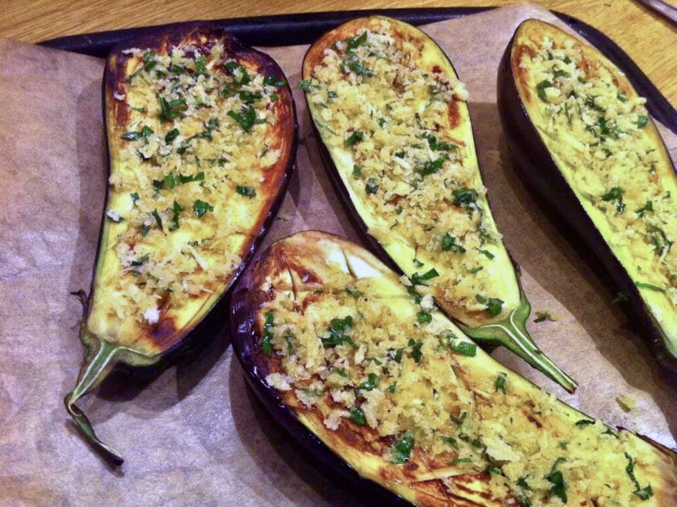 Wstaw blachę z bakłażanami do piekarnika nagrzanego do 180°C na około 20 do 25 minut.