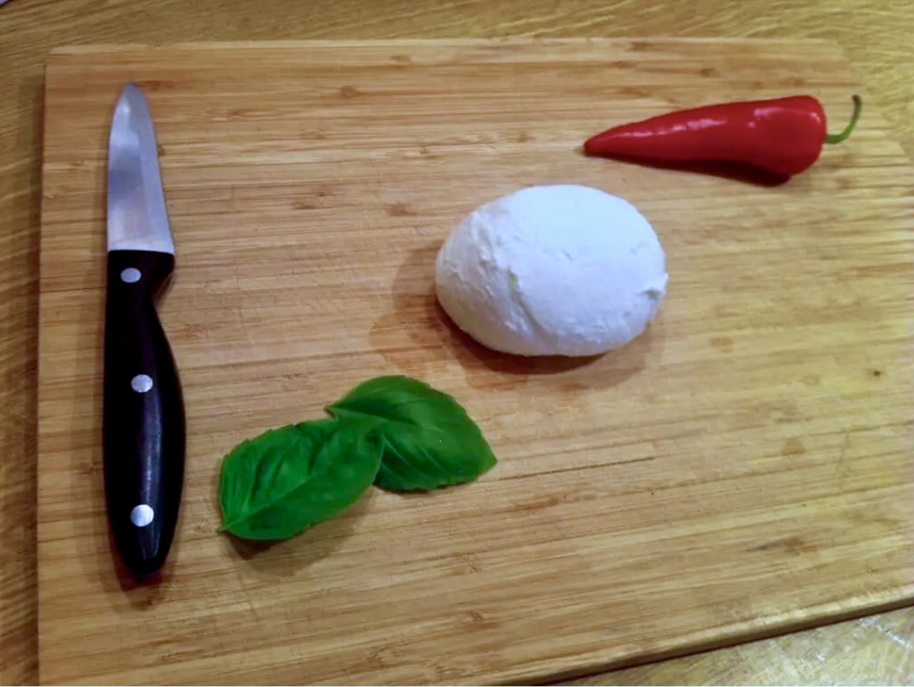 Przygotowanie dodatków: Podczas gdy bakłażany się pieką, pokrój mozzarellę w plastry albo porwij na małe kawałki, drobno posiekaj papryczkę chilli i przygotuj małe listki świeżej bazylii.
