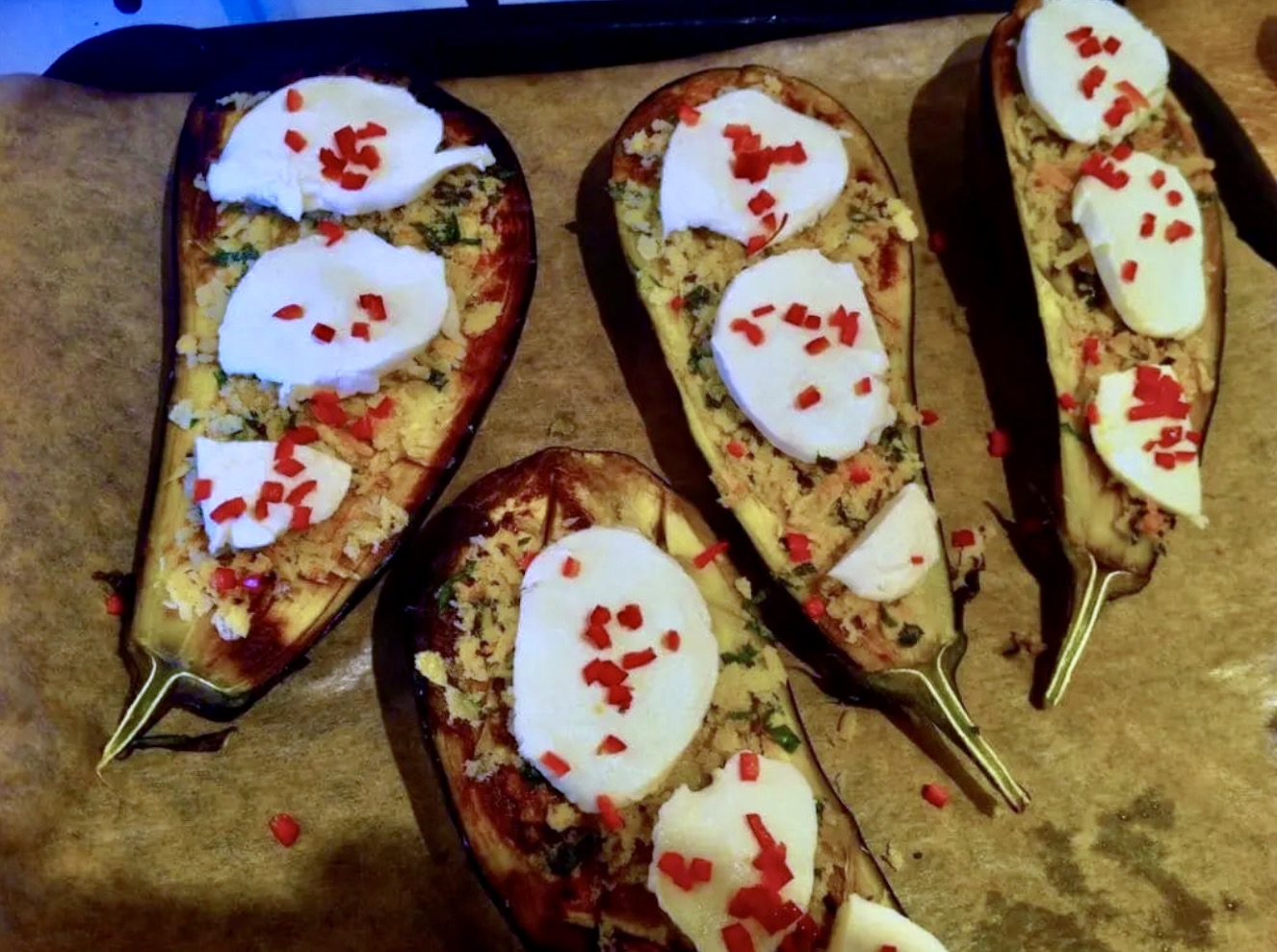 Finalne zapiekanie: Wyjmij bakłażany z piekarnika i rozłóż na nich mozzarellę oraz chilli. Następnie wstaw blachę z powrotem do piekarnika i piecz do momentu, aż mozzarella się stopi.