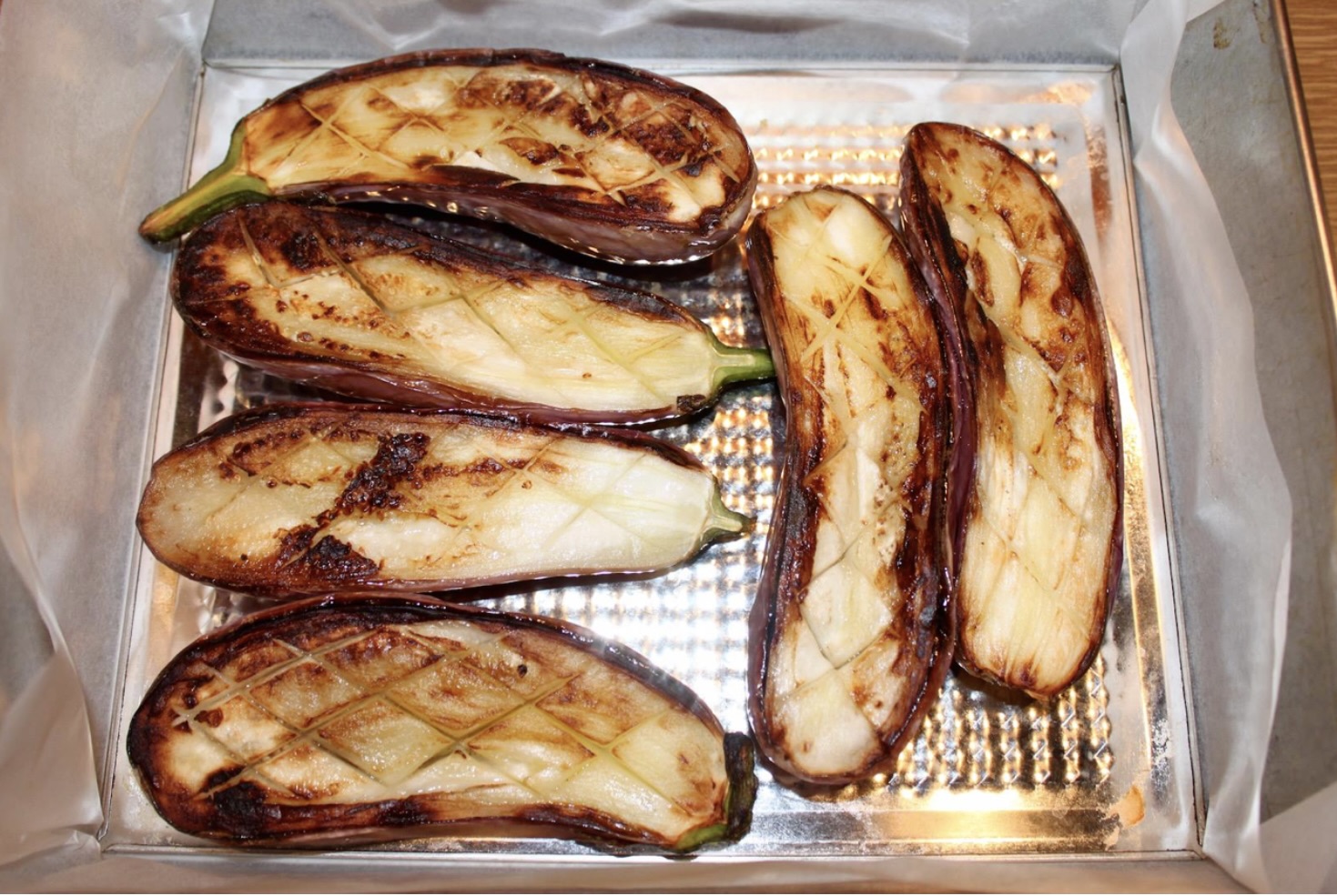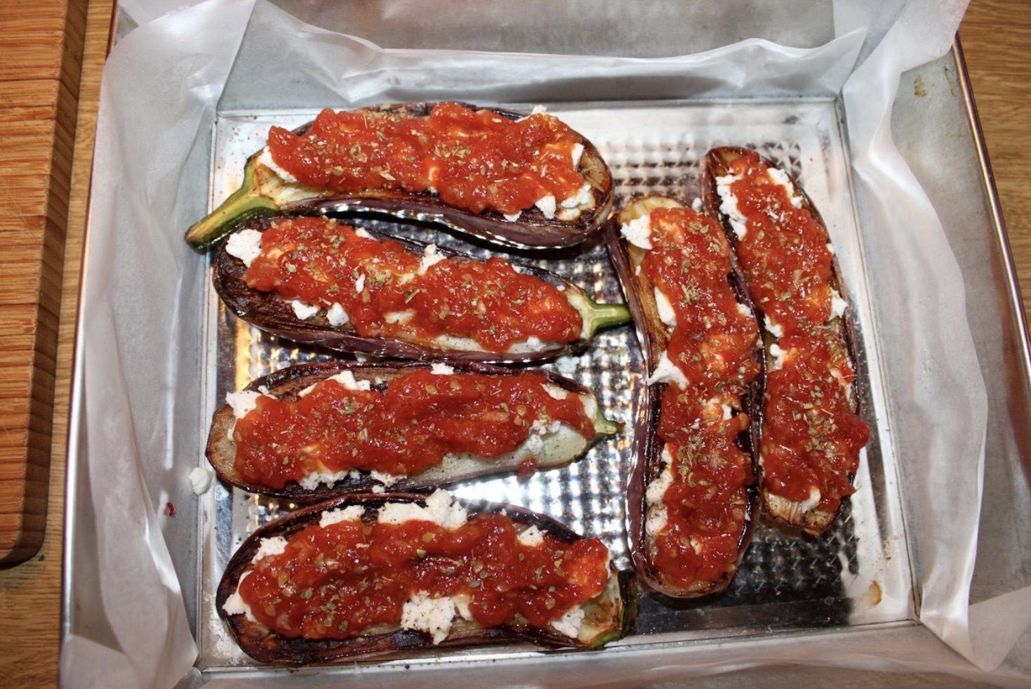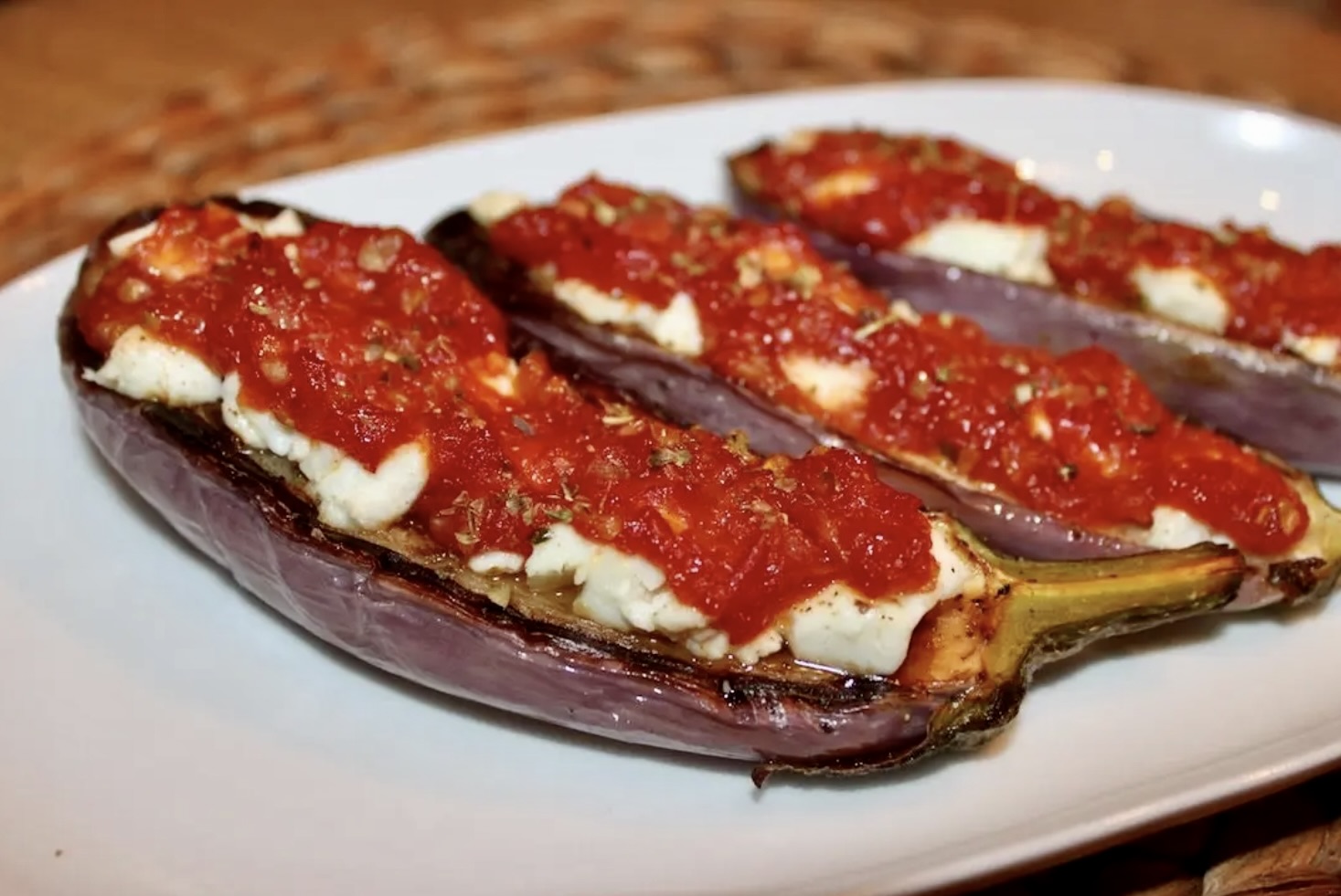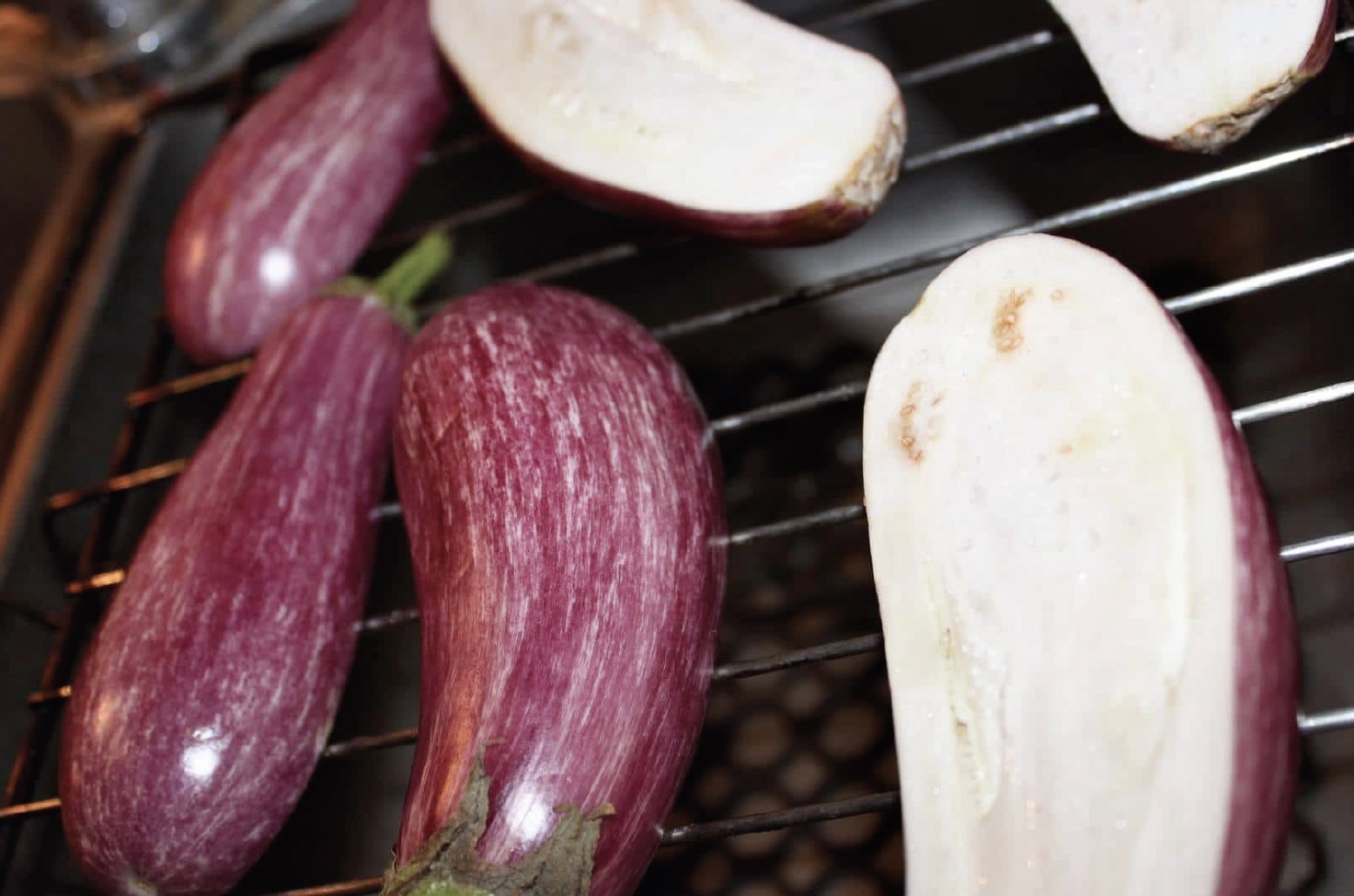 Piecz w piekarniku nagrzanym do 180°C przez około 20 minut, aż środki bakłażanów będą miękkie (powinny mieć konsystencję pasty pod naciskiem widelca).
