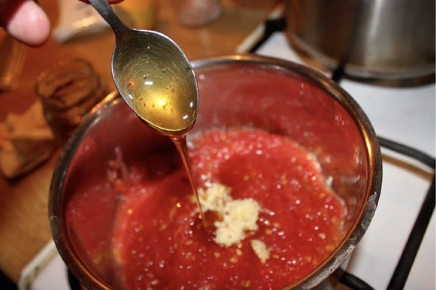 Dodaj 2 łyżeczki miodu, zmiażdżony ząbek czosnku, a także nieco soli.