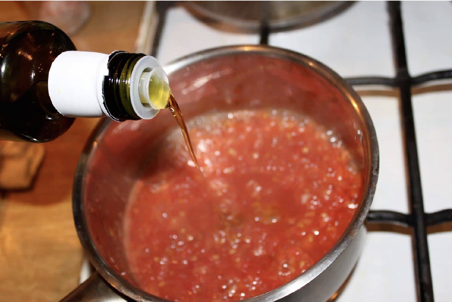 Na koniec wlej 2 łyżki oliwy extra vergine, dopraw do smaku i duś jeszcze 5 minut. Wyłącz gaz i odstaw sos na bok.