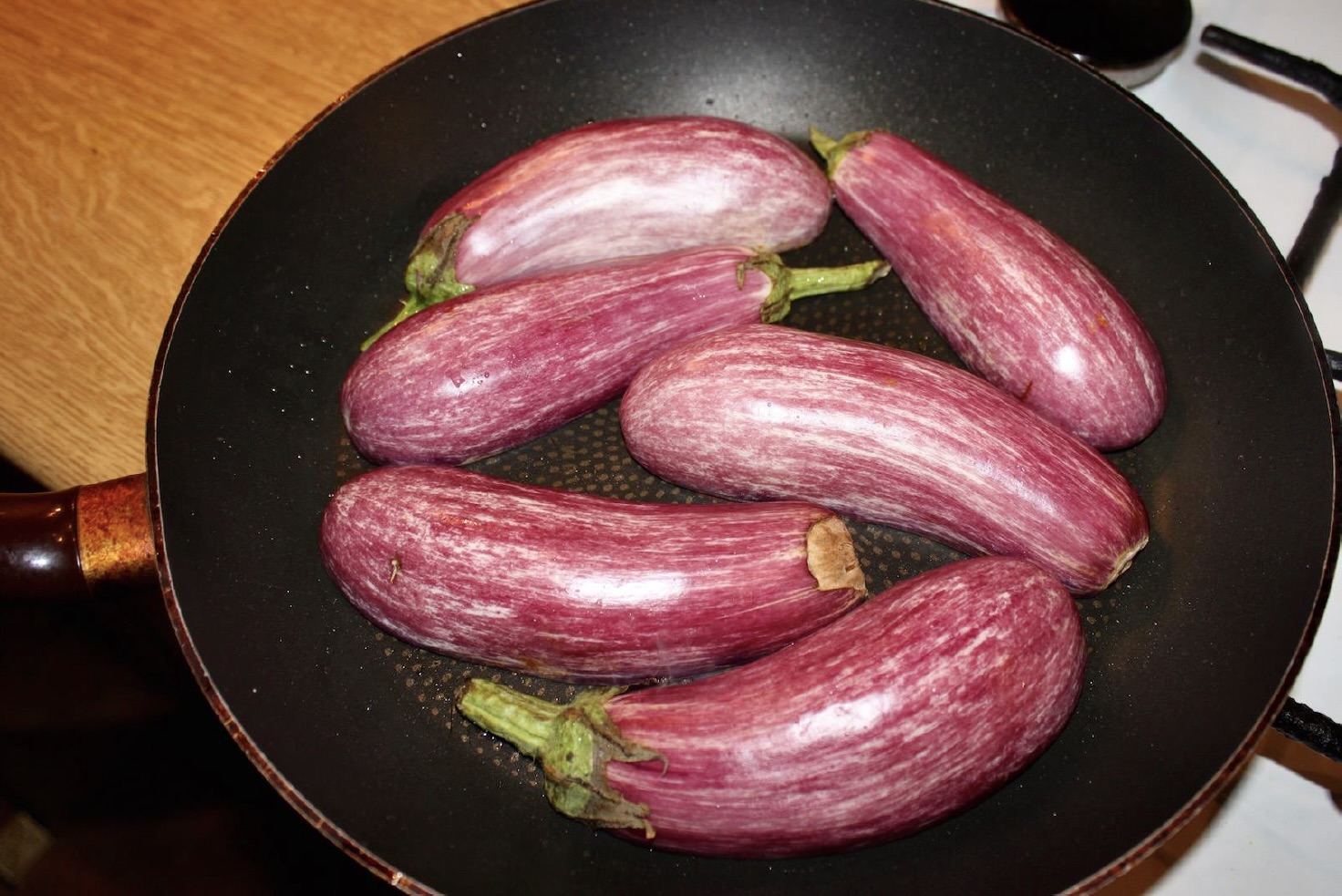 Rozłóż bakłażany skórką do góry i smaż, aż dobrze się przyrumienią.