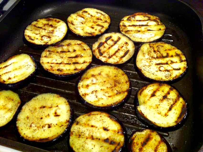Grillowanie: Smaż plastry bakłażana z obu stron na patelni grillowej na niewielkiej ilości oliwy, aż będą miękkie. Nadmiar tłuszczu odsącz na ręczniku papierowym.