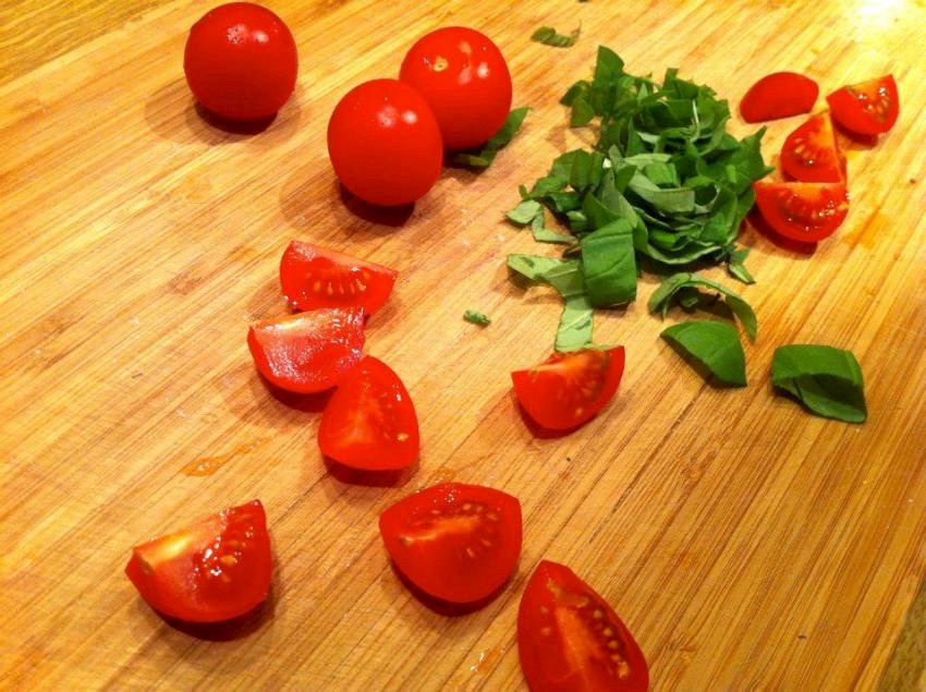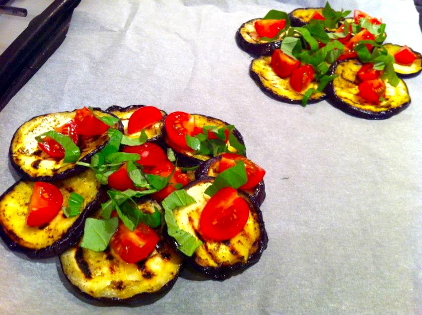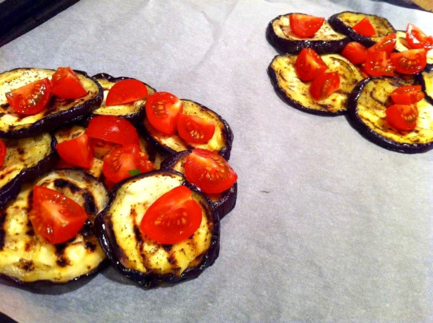 Dodatki: Pokrój pomidorki koktajlowe i posiekaj świeżą bazylię. Rozłóż pomidorki i bazylię na plastrach bakłażana.