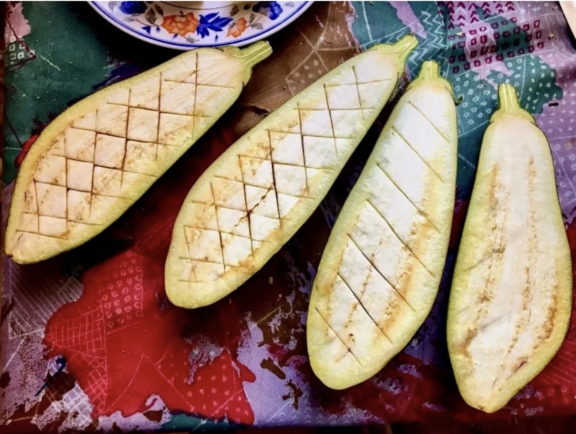 Przygotowanie bakłażana: Bakłażany przekrój na pół wzdłuż, a następnie ponacinaj ich wnętrze „na krzyż” (w kratkę).