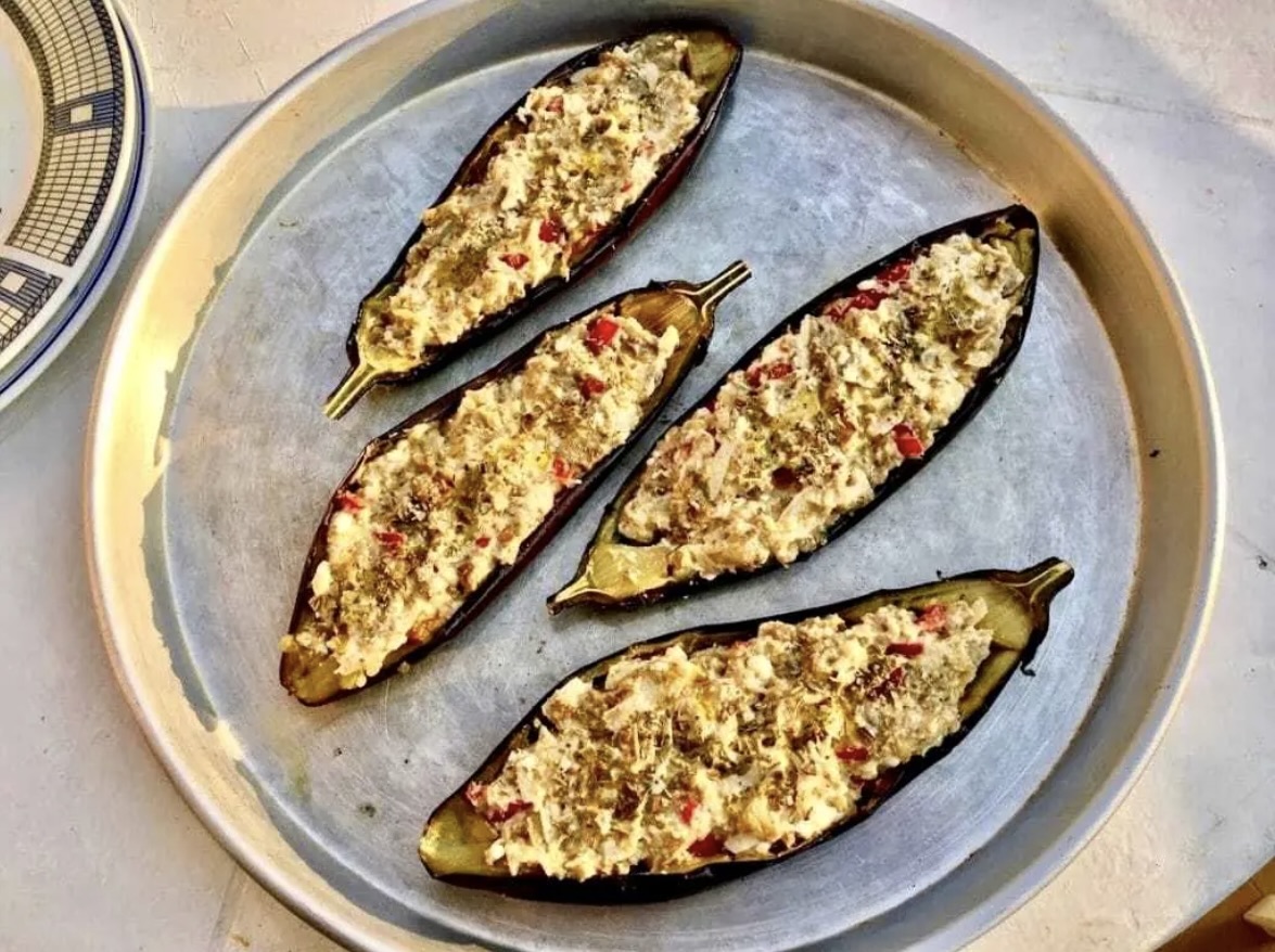 Zapieczenie: Wypełnij skórki bakłażana przygotowanym farszem serowym, ułóż na blasze posmarowanej oliwą. Wstaw do piekarnika nagrzanego do 180°C na około 10 minut.