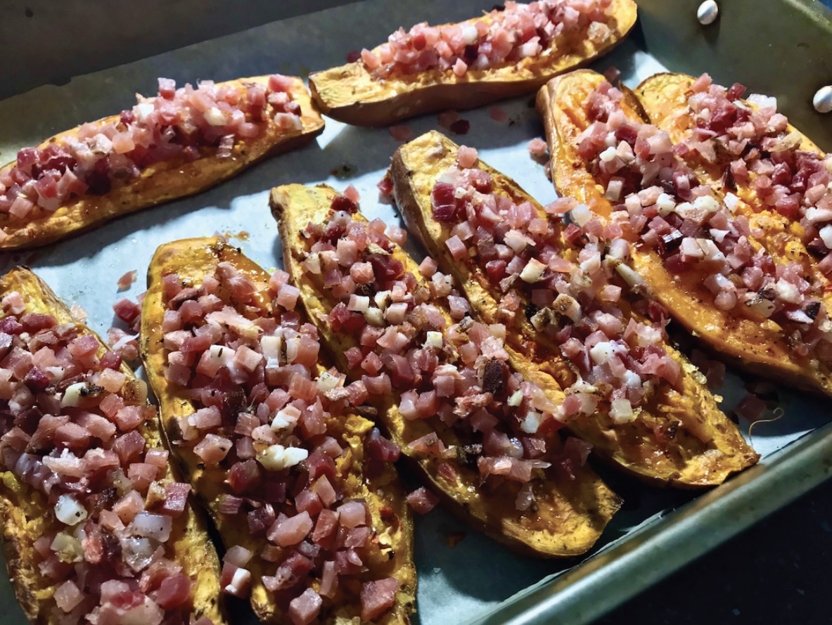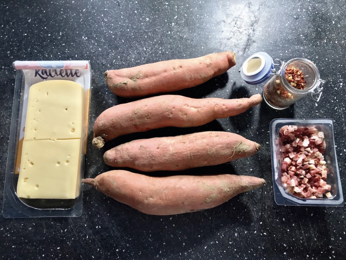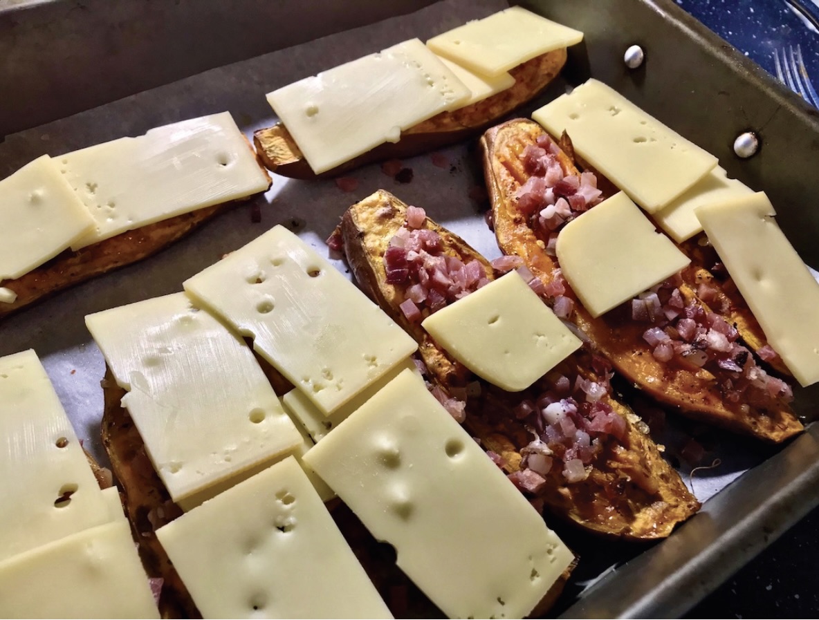 Bataty zapiekane z serem raclette i speckiem