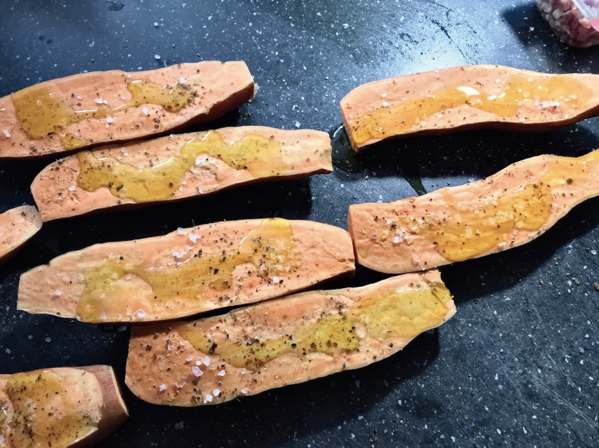 Przygotowanie batatów: Przekrój bataty wzdłuż na połówki (odcinając niejadalne końcówki).