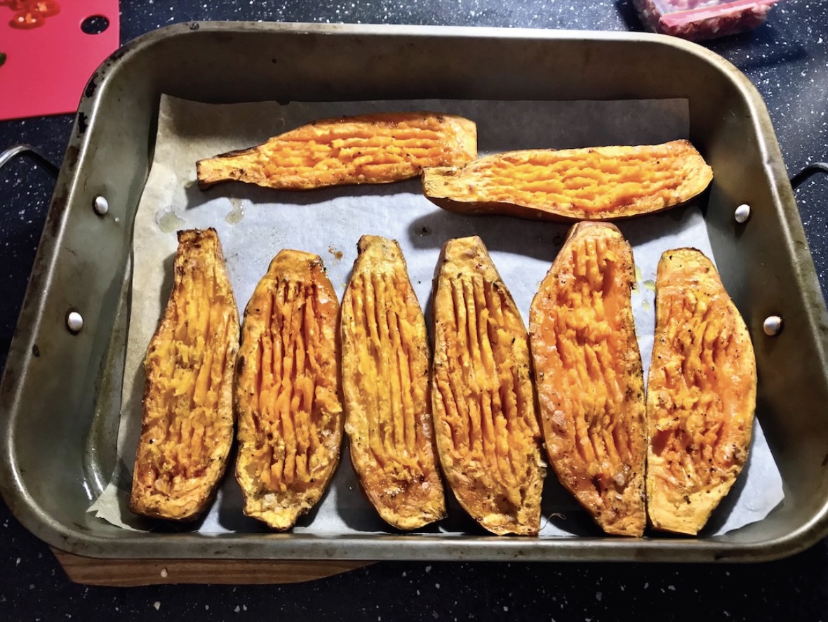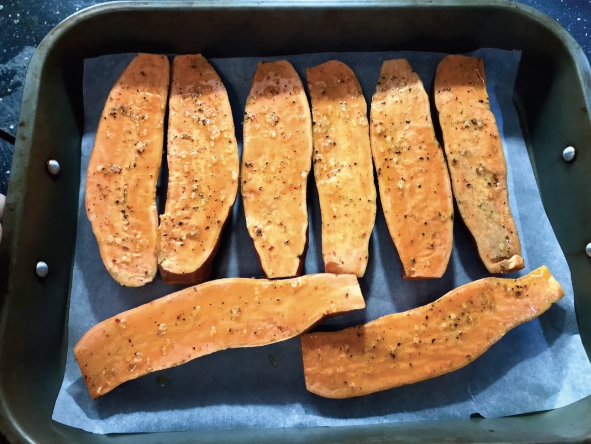 Finałowe zapiekanie: Gdy bataty są miękkie, wyjmij je z piekarnika. Widelcem lekko spulchnij miąższ.