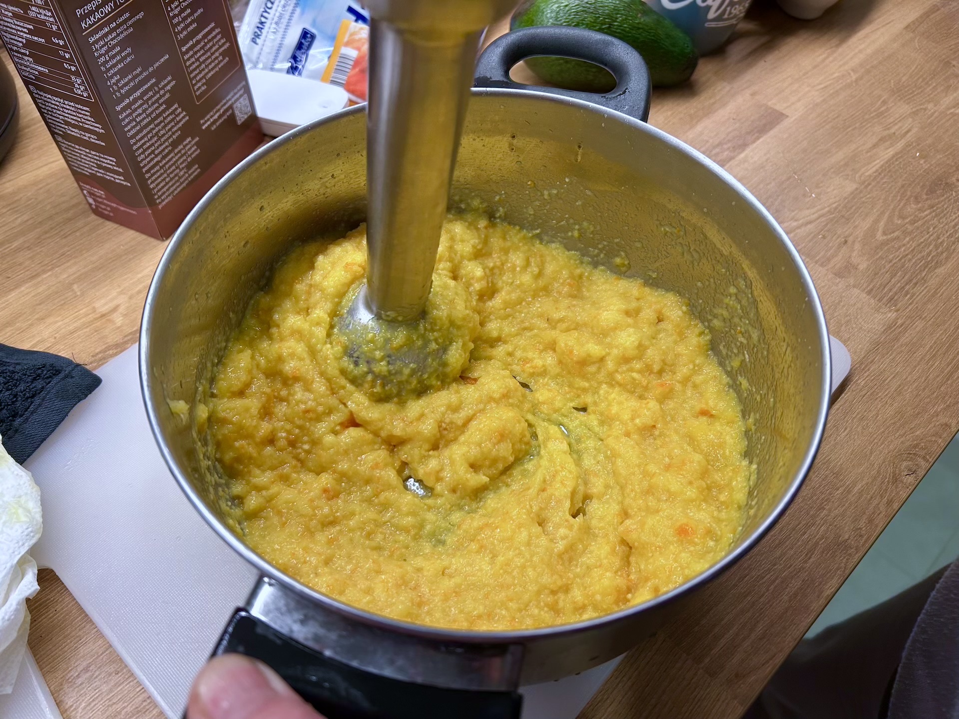 Wystudzone pomarańcze podziel na mniejsze części i zmiksuj w całości (razem ze skórką) w malakserze na gładką, aromatyczną pastę.