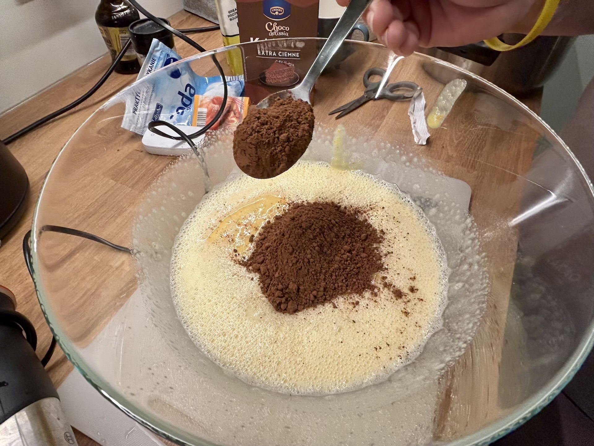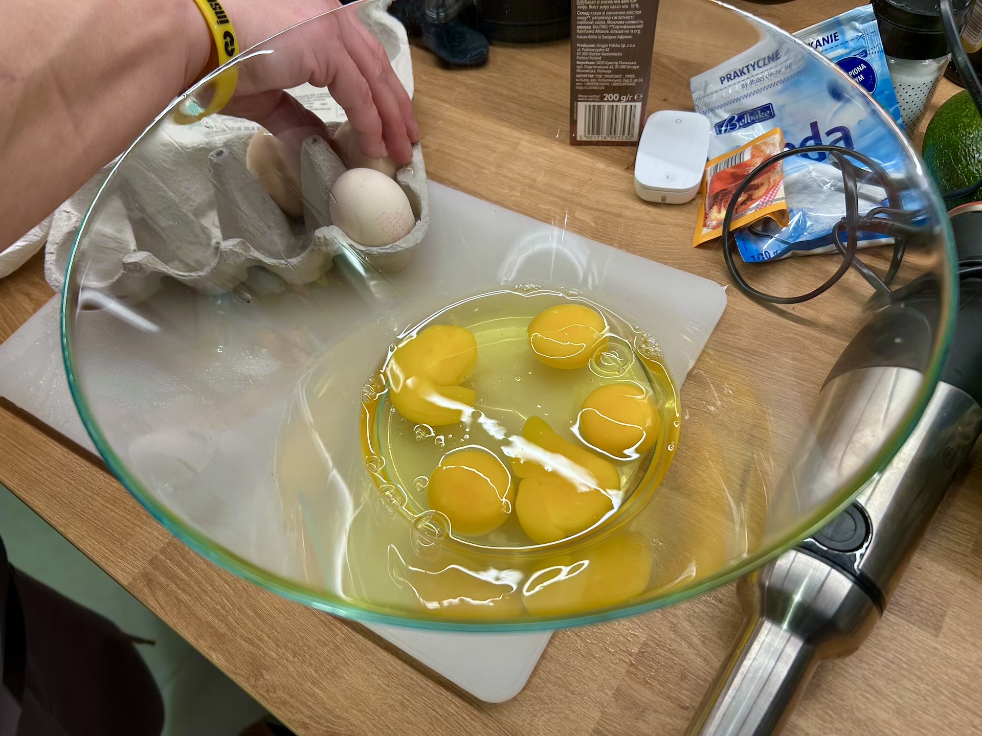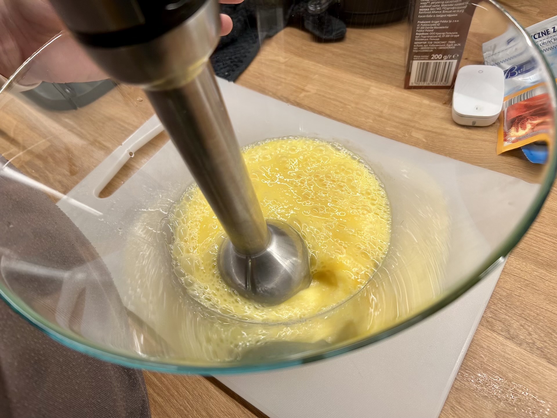 W dużej misce ubij 6 jajek z cukrem na puszystą i jednolitą masę.