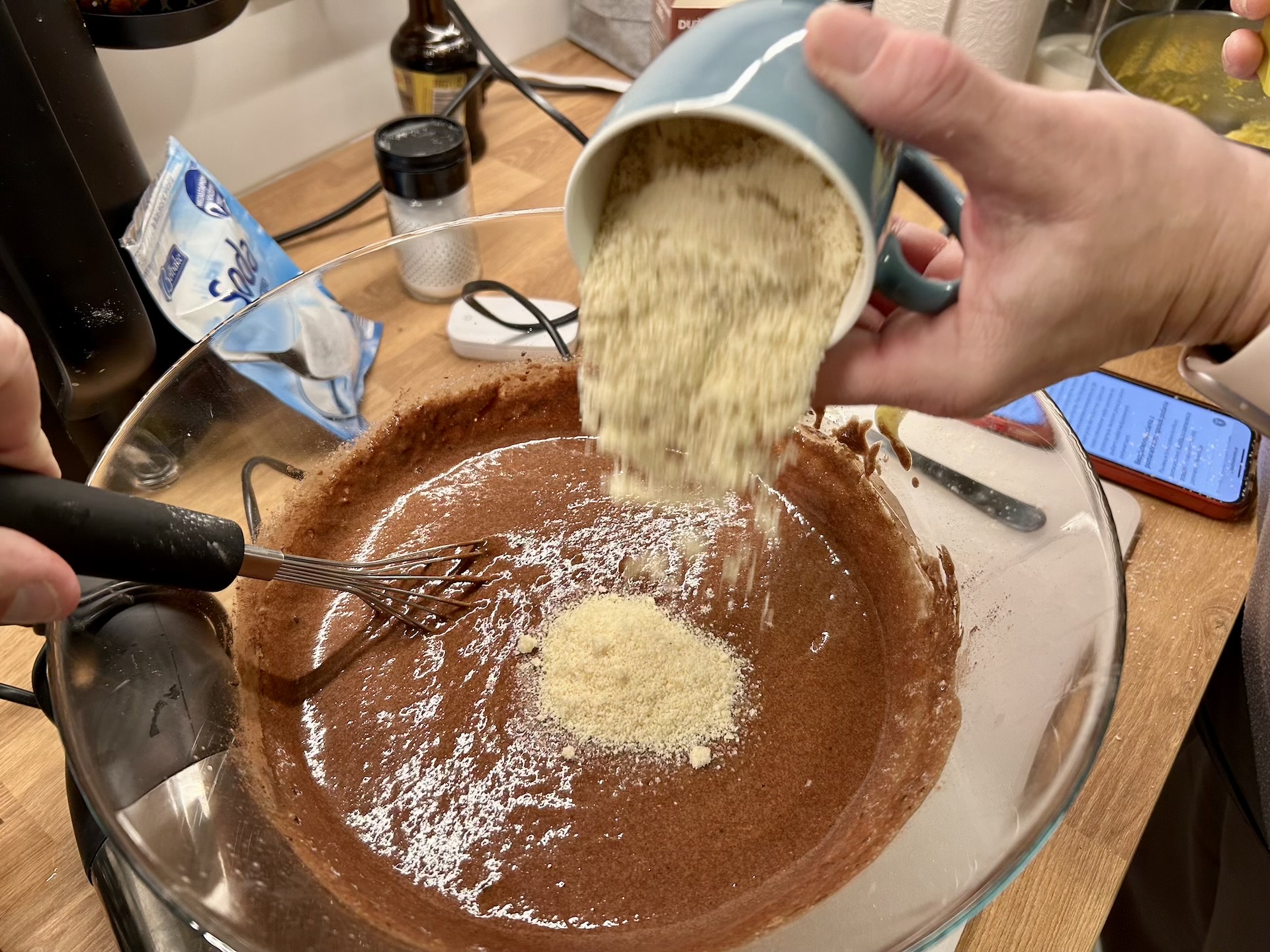 Następnie wsyp mąkę migdałową, proszek do pieczenia, sodę oraz szczyptę soli. Całość wymieszaj na jednolite ciasto.