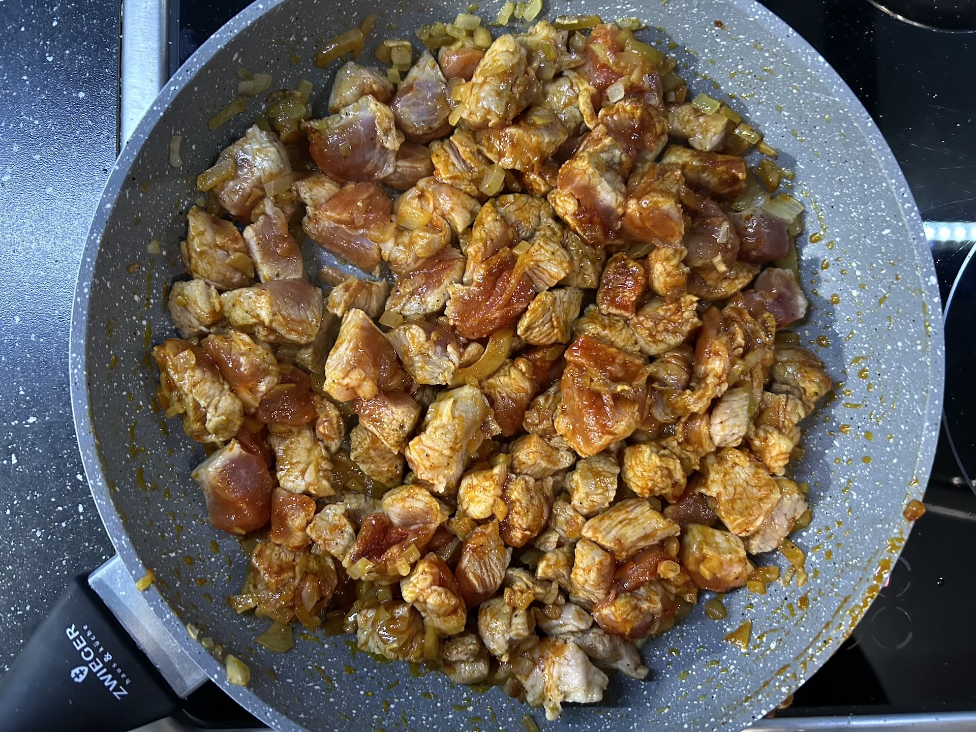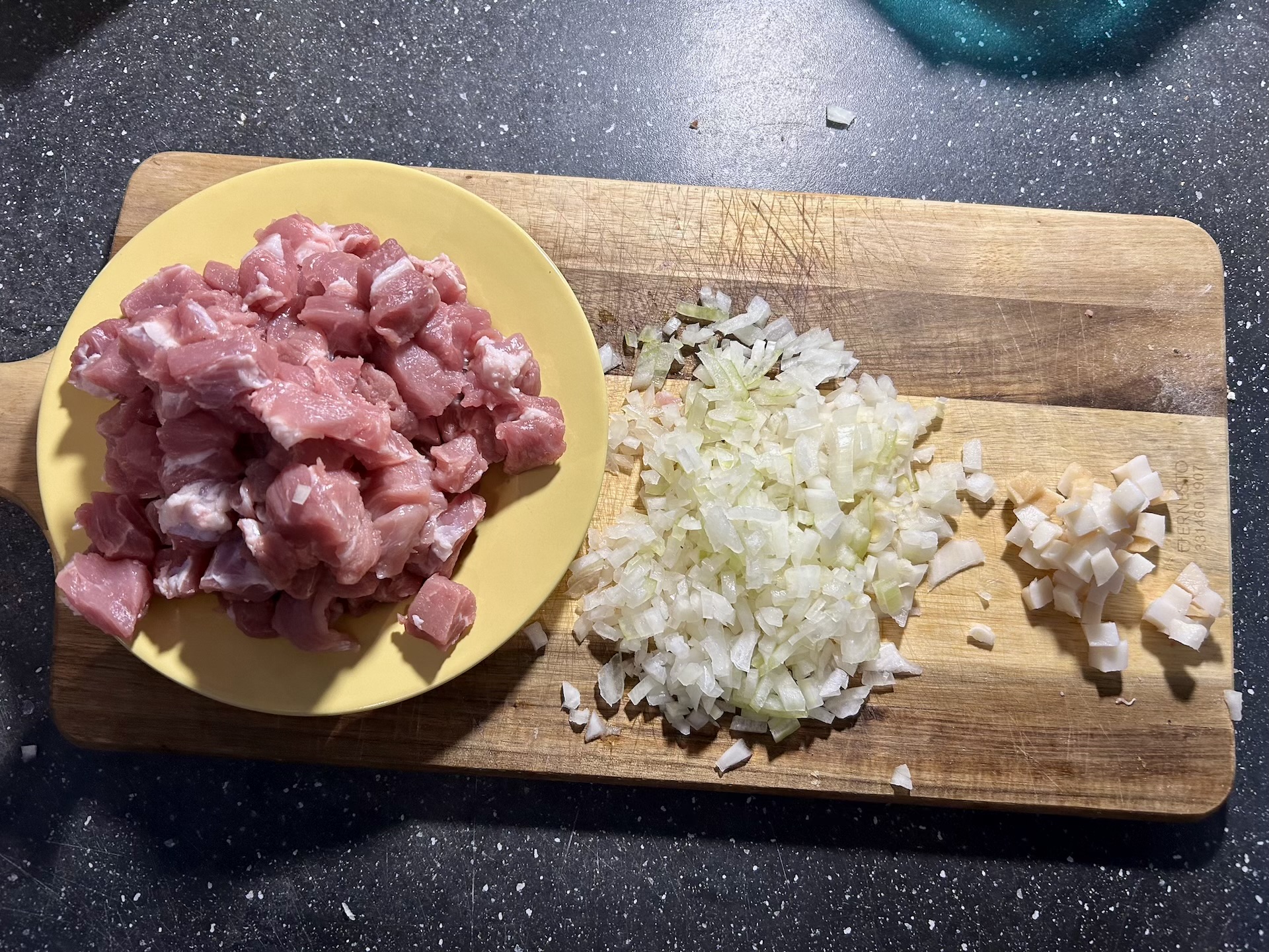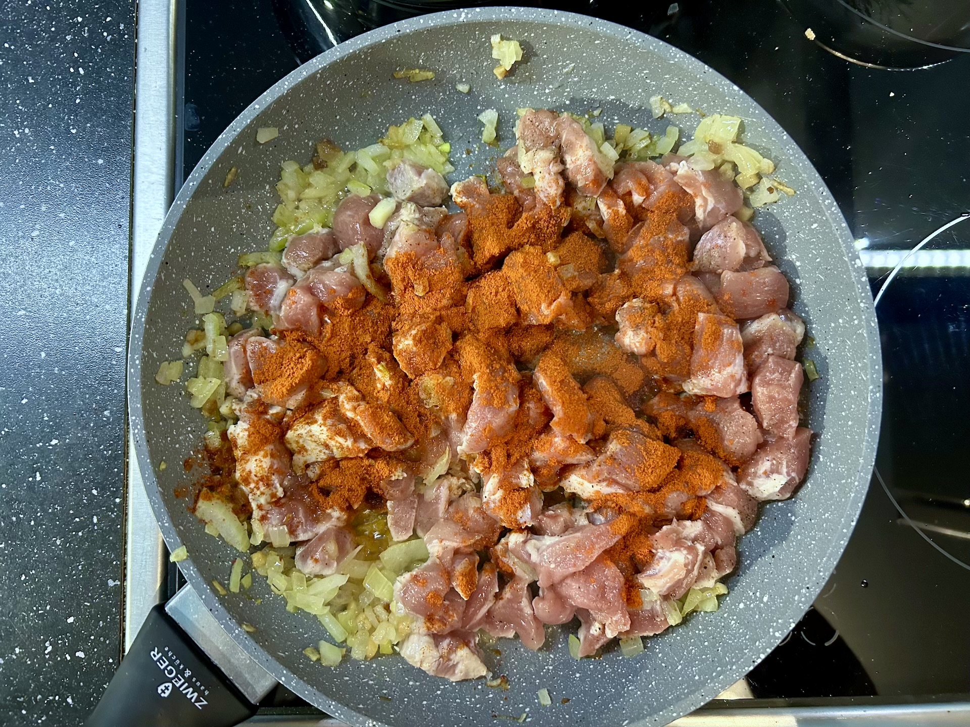 Gulasz: Mięso i cebulę pokrój w kostkę. Zeszklij cebulę na tłuszczu, dodaj mięso, dopraw solą, pieprzem i papryką. Smaż do przyrumienienia. Następnie całość przełóż do garnka, podlej wodą i duś w „krótkim sosie” (mała ilość płynu).