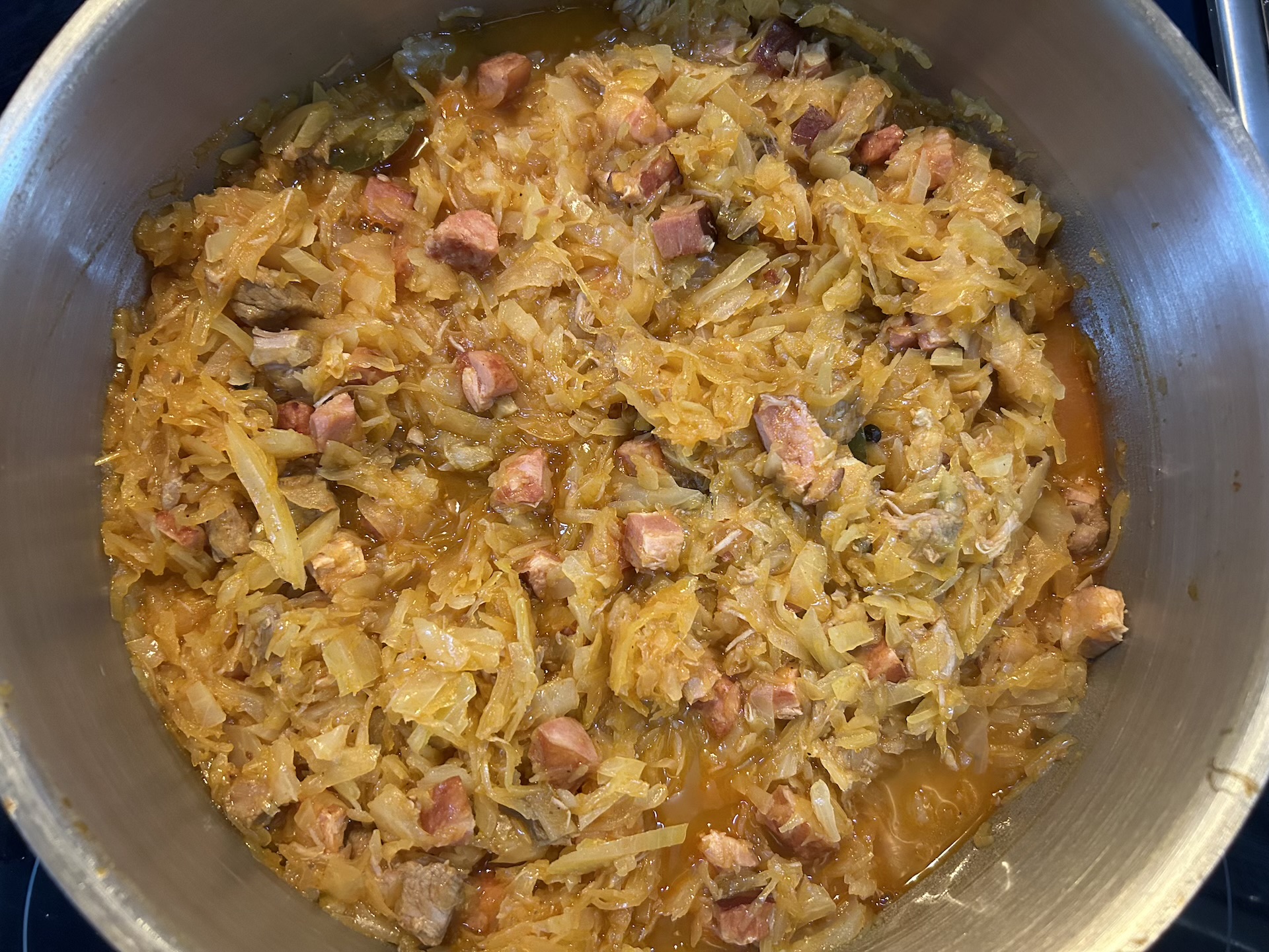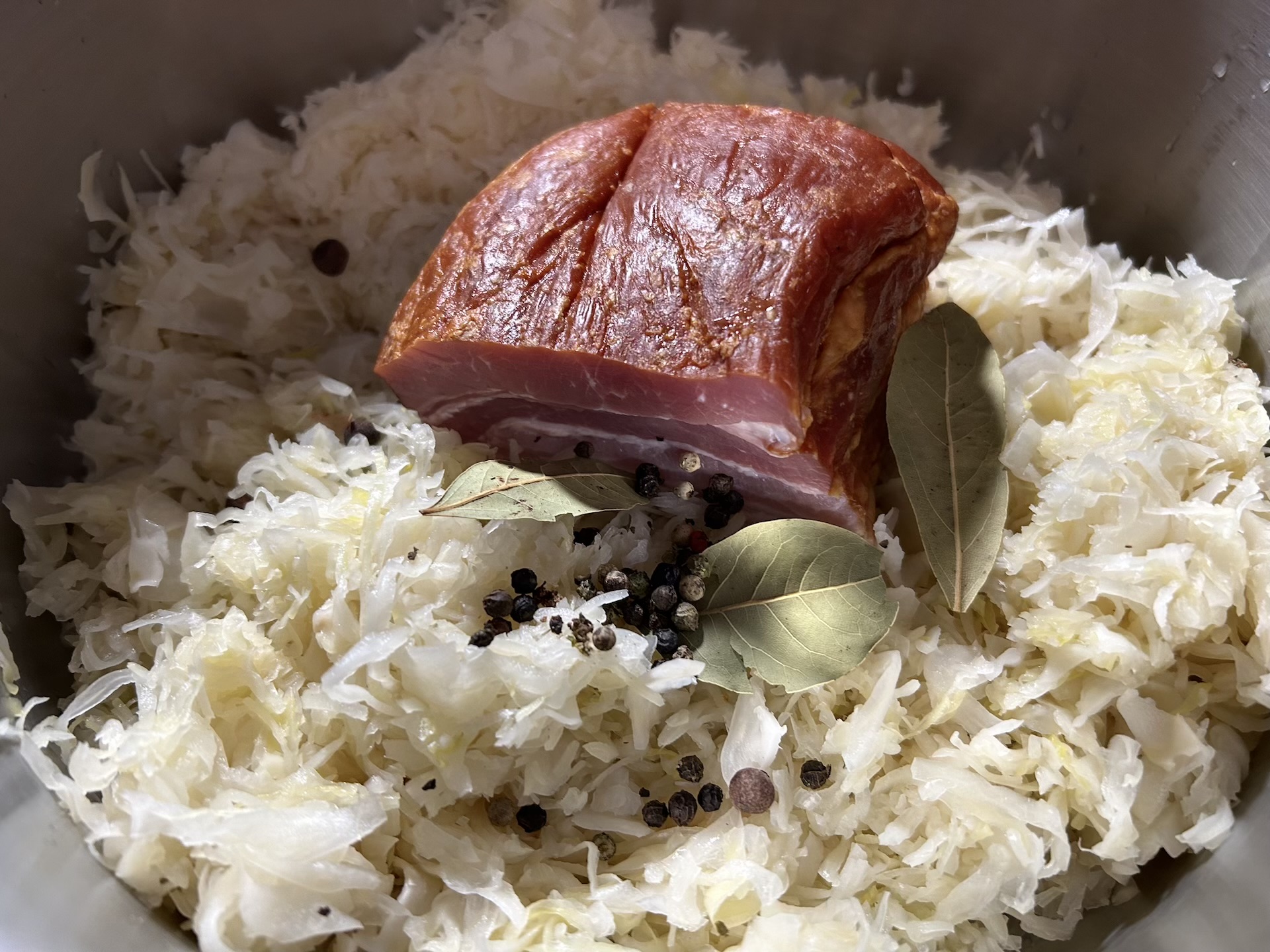 Kapusta kiszona: Kapustę posiekaj, włóż do dużego garnka z boczkiem wędzonym w całości, zielem angielskim, liściem laurowym i pieprzem. Zalej niewielką ilością wrzątku i gotuj pod przykryciem ok. 1 godzinę do miękkości.
