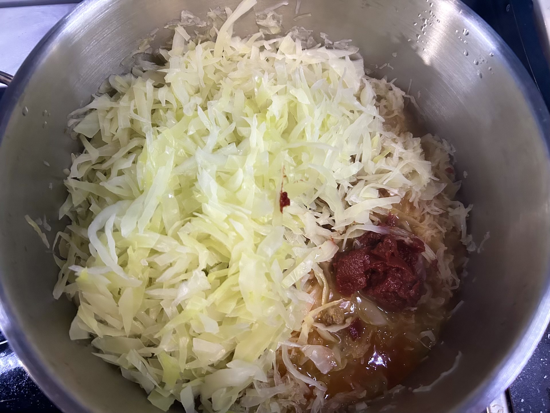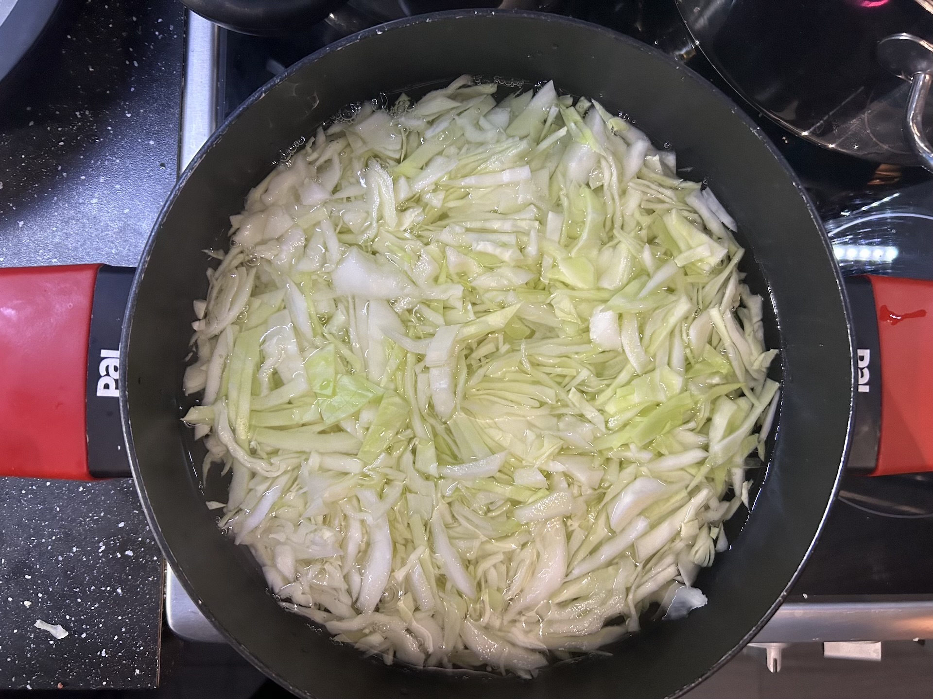 Kapusta biała: Posiekaj, zalej wrzątkiem, a następnie gotuj osobno do stanu al dente. Odcedź.