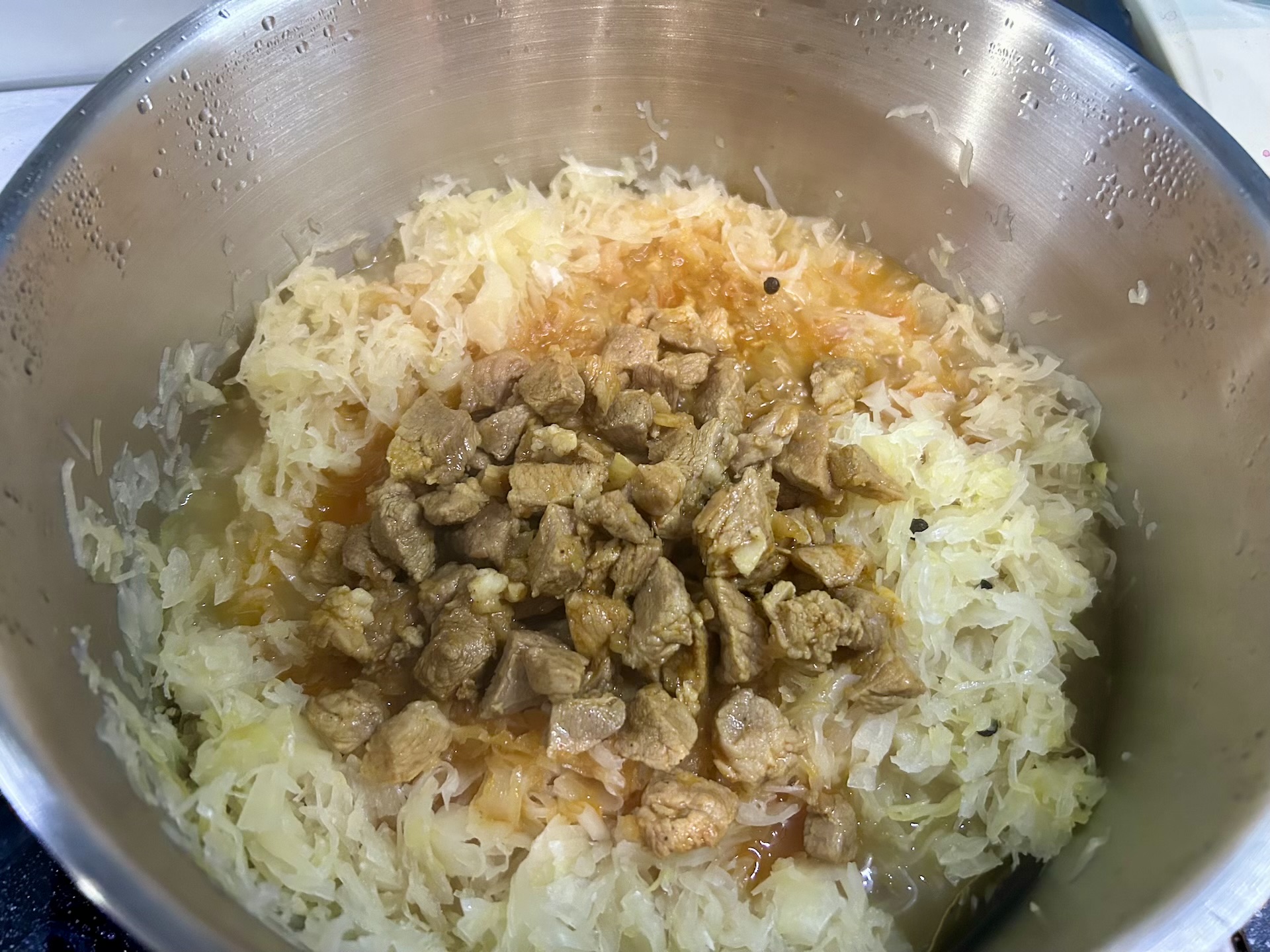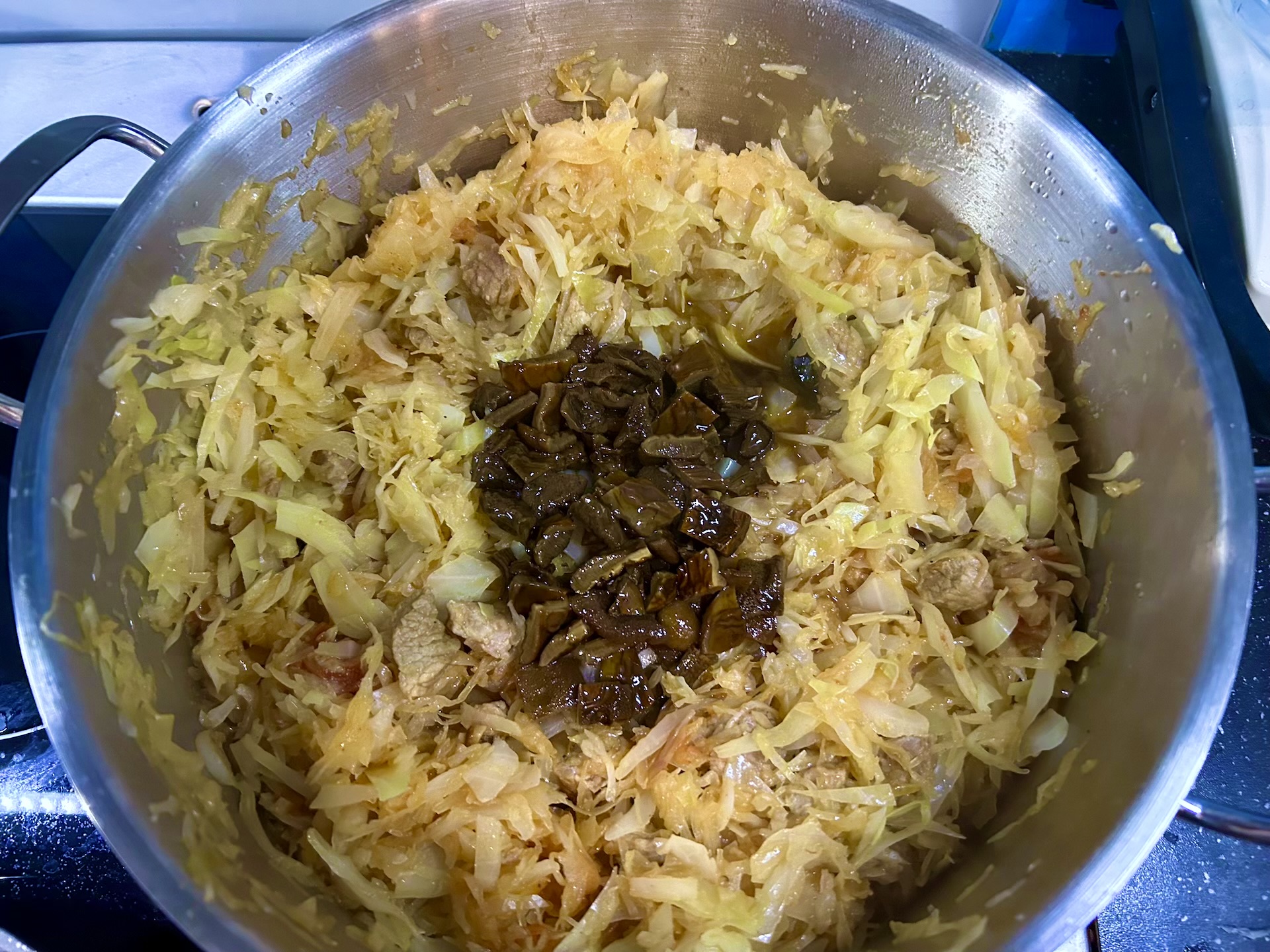 Do garnka z kapustą kiszoną dodaj gulasz, odcedzoną białą kapustę, podsmażoną kiełbasę z boczkiem, przecier pomidorowy oraz grzyby wraz z wodą z ich gotowania.