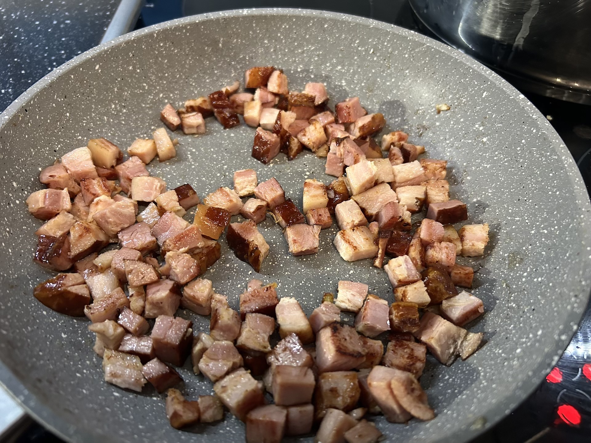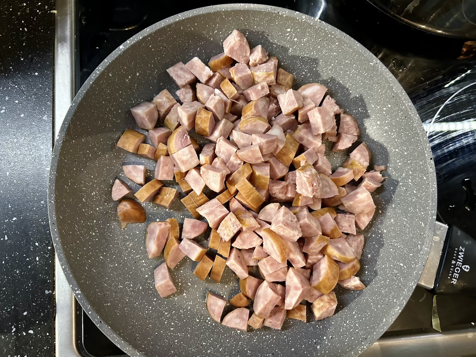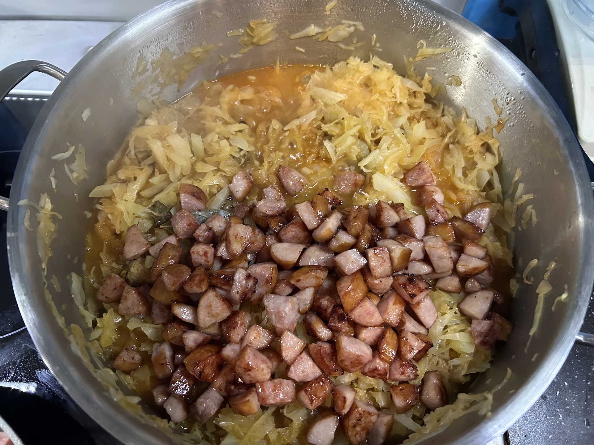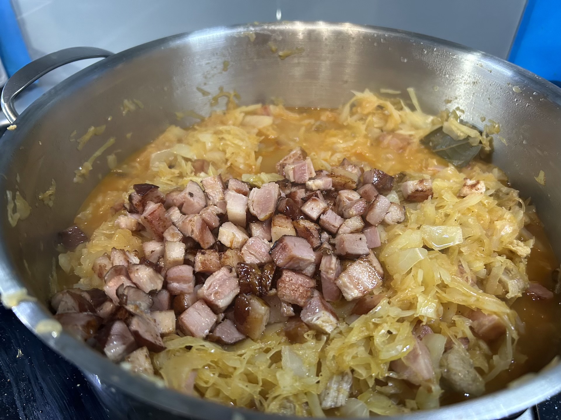 Z ugotowanej kapusty kiszonej wyjmij boczek (pokrój go w kostkę i podsmaż wraz z pokrojoną kiełbasą).