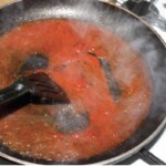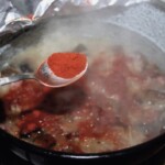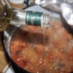Łączenie i Duszenie: Do bigosu dodać wędzone śliwki, namoczone podgrzybki (wraz z wodą, w której się moczyły), papryki. Wyjąć gicz z dzika, obrać z mięsa, a następnie dodać je do bigosu. Wlać rozgrzany na patelni koncentrat pomidorowy.