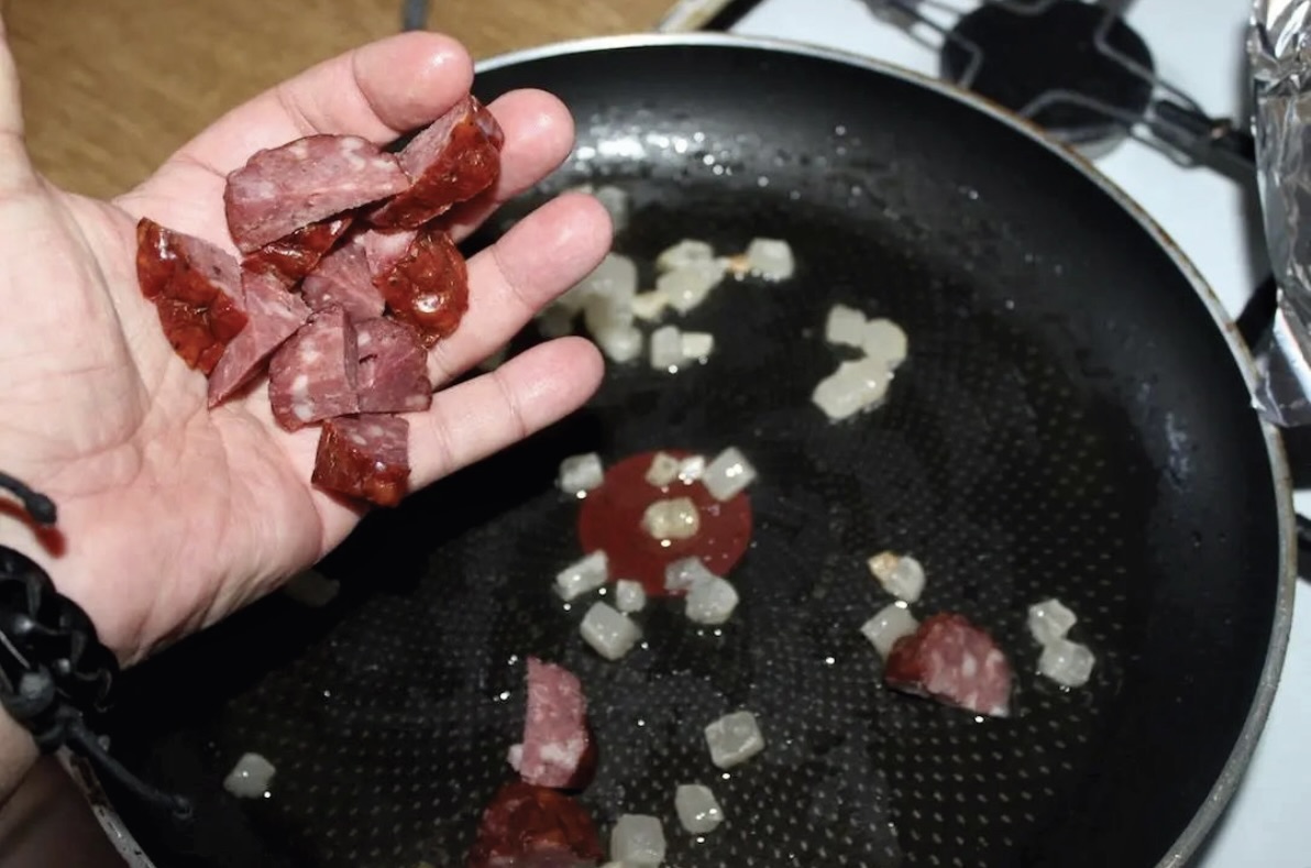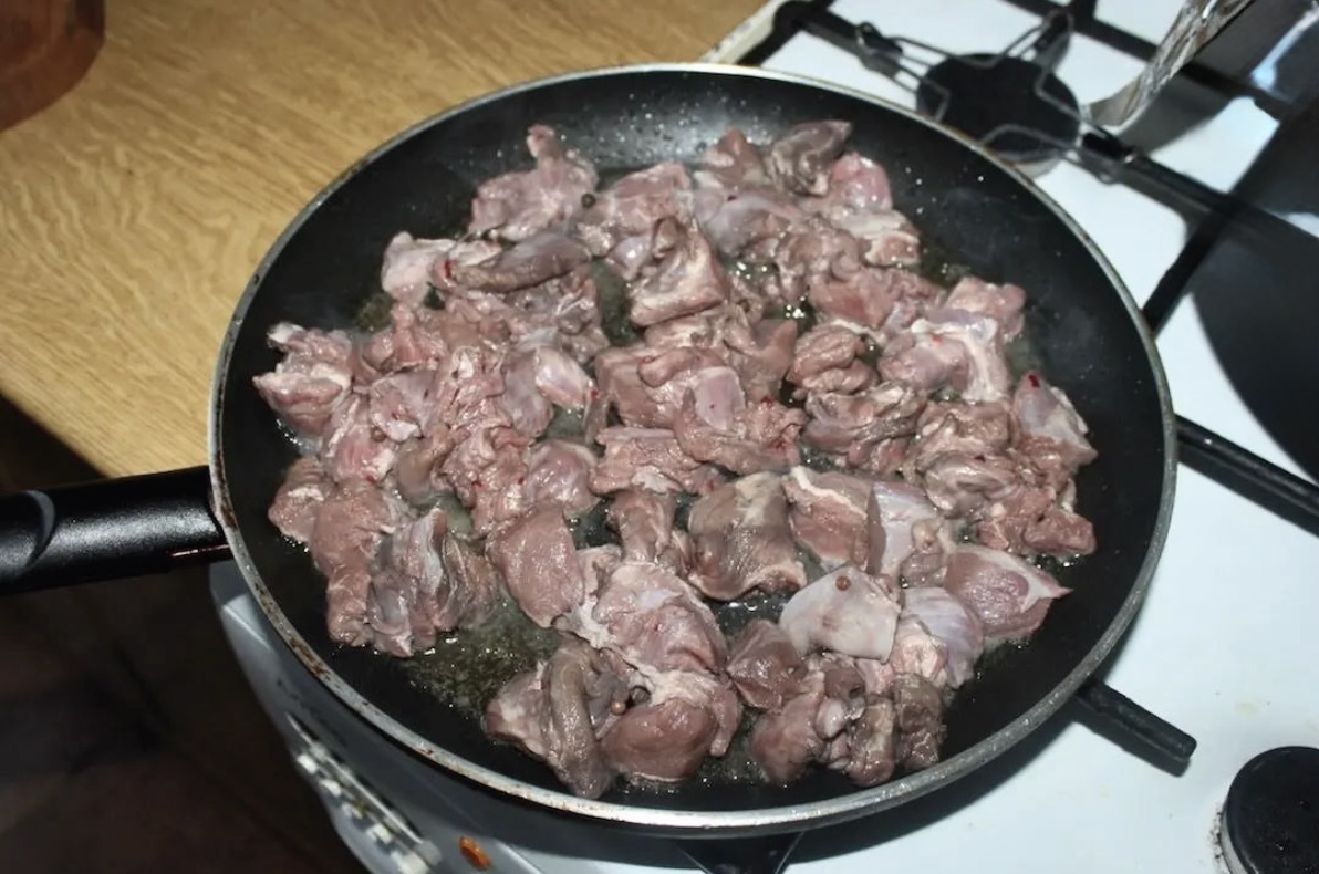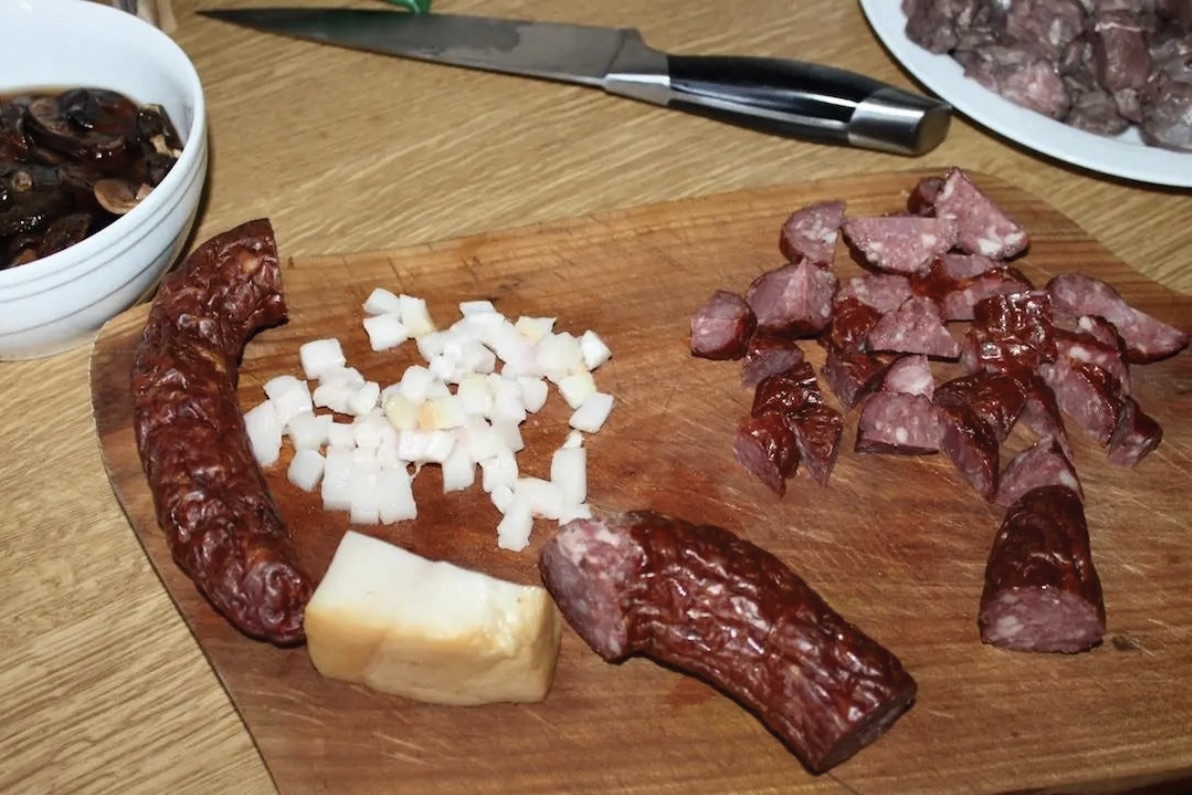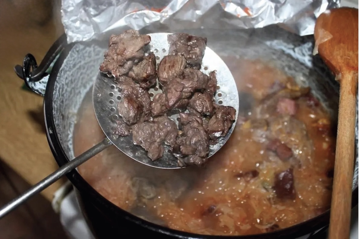 Przesmażanie Składników: Na smalcu przesmaża się pokrojoną słoninę i kiełbasę z jelenia, a następnie dodaje do kapusty. Następnie na tym samym tłuszczu smaży się zamarynowane mięso z dzika i sarny i również przekłada do garnka.