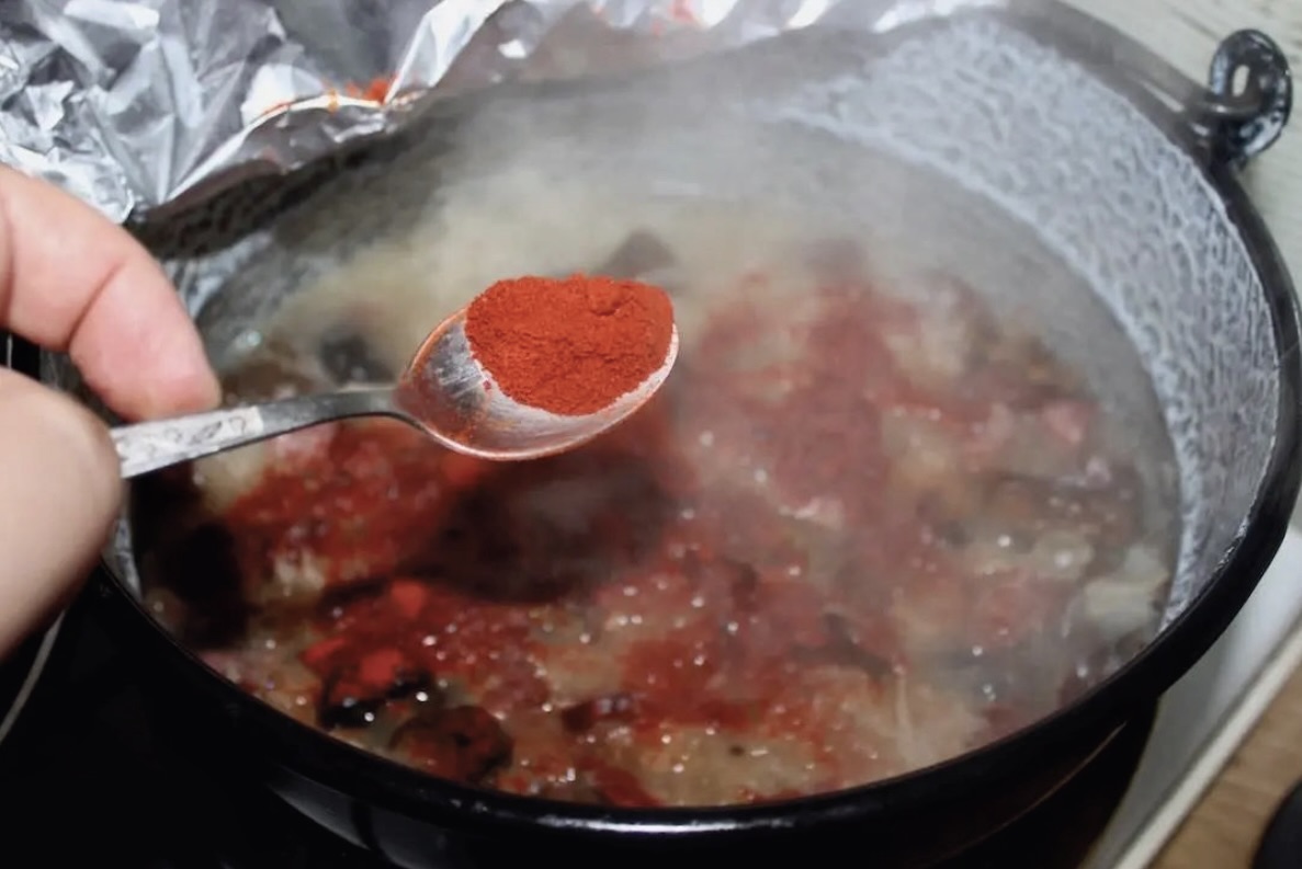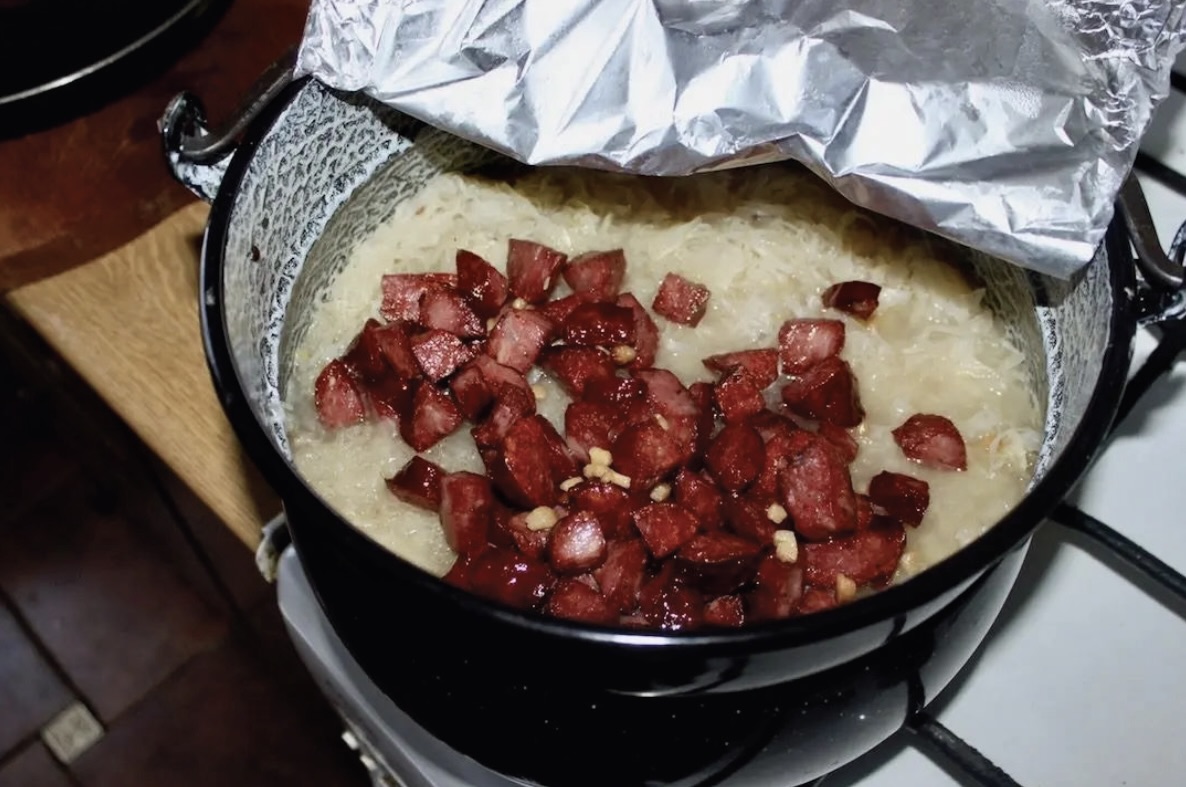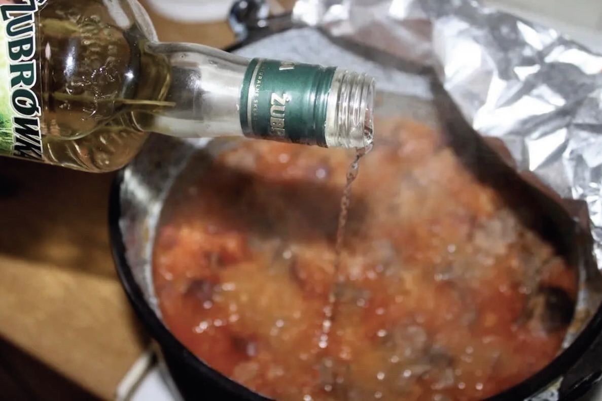 Konieczne Duszenie: Bigos gotować przez kolejne 1 do 1,5 godziny, aż mięso będzie miękkie, a w smaku pojawi się delikatna nuta Żubrówki.