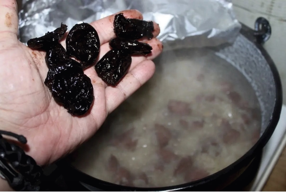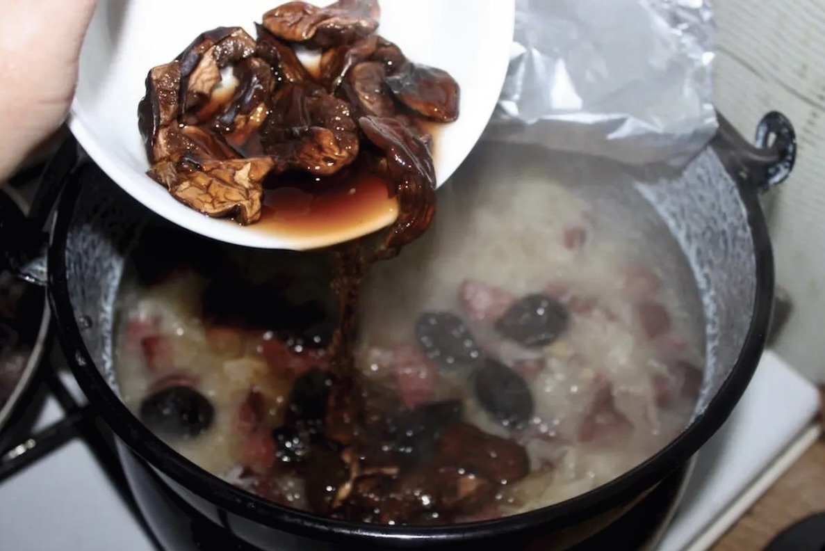 Łączenie i Duszenie: Do bigosu dodać wędzone śliwki, namoczone podgrzybki (wraz z wodą, w której się moczyły), papryki. Wyjąć gicz z dzika, obrać z mięsa, a następnie dodać je do bigosu. Wlać rozgrzany na patelni koncentrat pomidorowy.