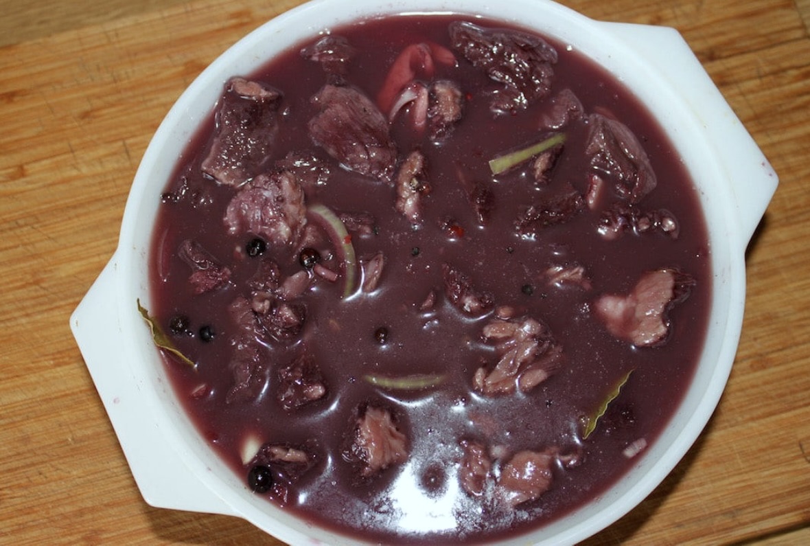 Przerośniętą wołowinę (lub dziczyznę) pokrój w drobną kostkę, a następnie marynuj w lodówce przez kilkanaście godzin w przygotowanym roztworze (wino, cebula, czosnek, przyprawy).