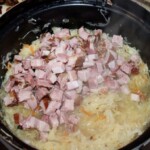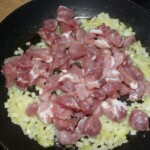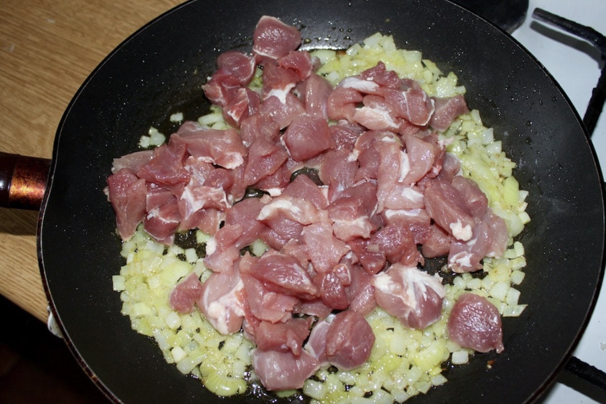Na niewielkiej ilości oliwy zeszklij cebulę, dodaj pokrojony w kostkę karczek lub łopatkę wieprzową.