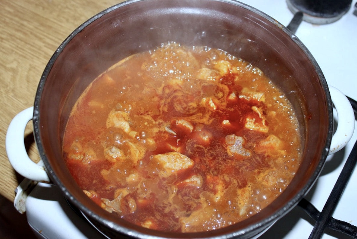 Gdy mięso się zrumieni, wsyp łyżkę słodkiej, mielonej papryki. Wymieszaj, wlej pół szklanki wrzącej wody, a następnie duś na wolnym ogniu do miękkości (w razie potrzeby uzupełniaj wodą). Zawartość patelni przełóż do garnka.
