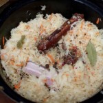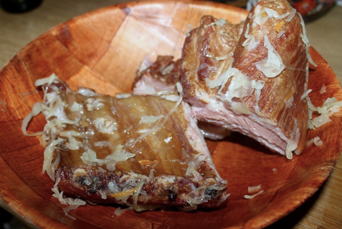 Z garnka z kapustą kiszoną wyjmij żeberka i boczek. Oddziel mięso od kości, pokrój na kawałki, a następnie włóż z powrotem do garnka z kapustą kiszoną.