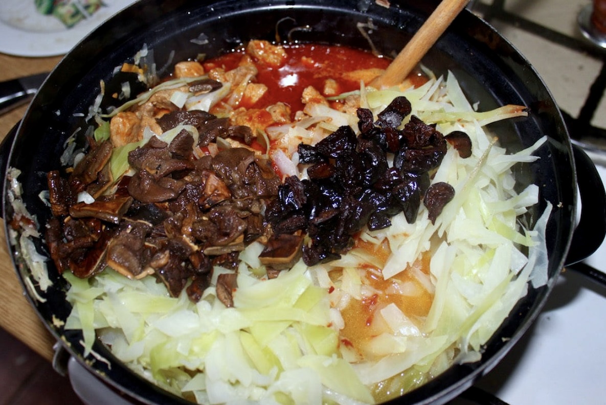 Dodaj pokrojone suszone grzyby razem z wywarem (wcześniej namoczone i ugotowane) oraz wędzone śliwki węgierki. Wymieszaj i gotuj na małym ogniu.