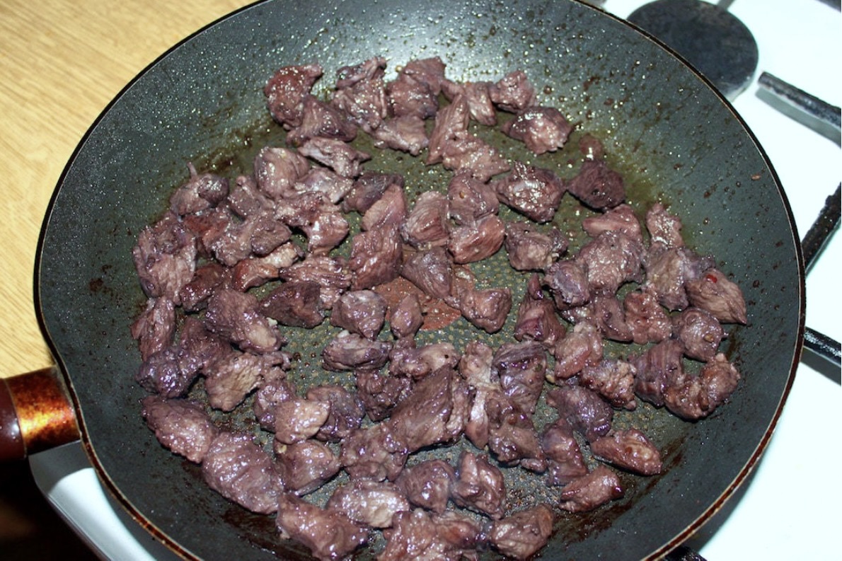 Następnie na patelni usmaż zamarynowaną i odcedzoną wołowinę/dziczyznę. Zrumienione mięso dodaj do bigosu.